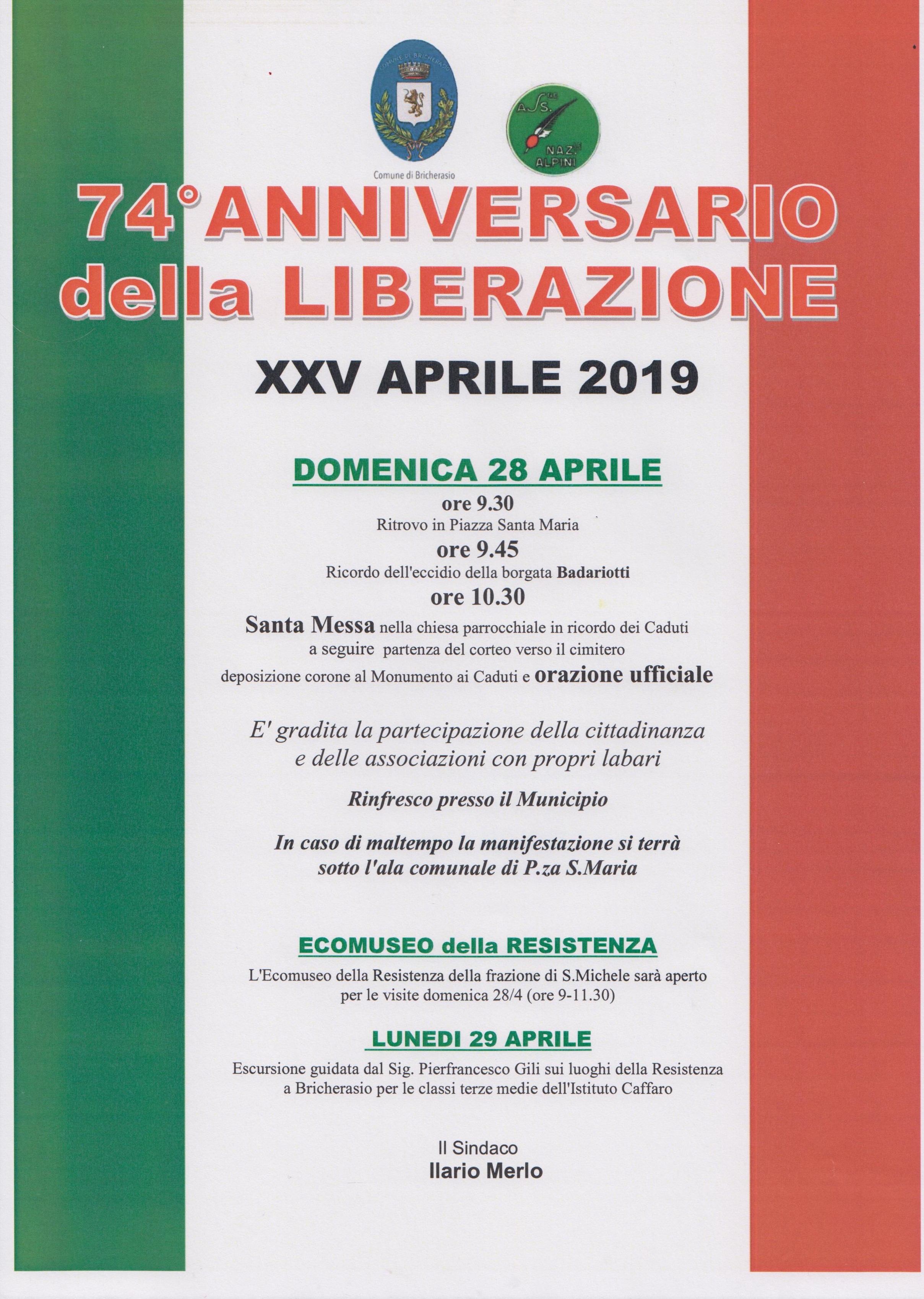In occasione del 74º Anniversario della Liberazione, il Comune di Bricherasio invita la popolazione a partecipare alle manifestazioni celebrative che si terranno domenica 28 aprile. Alle ore 9.30 il ritrovo in Piazza Santa Maria per recarsi alla Borgata Badariotti per il ricordo dell’eccidio. La Santa Messa delle ore 10.30 nella chiesa parrocchiale, in ricordo dei caduti, precede la deposizione delle corone al Monumento dei Caduti e dei Partigiani, e l’orazione ufficiale con la partecipazione della Filarmonica San Bernardino. Sarà gradita la partecipazione della cittadinanza e delle associazioni comunali, con i propri labari. In caso di maltempo la manifestazione si terrà sotto l'ala comunale di Piazza Santa Maria. Un'appendice alle commemorazioni si svolge, infine lunedì 29 aprile, con l’escursione, organizzata per i ragazzi delle terze medie dell’Istituto Caffaro bricherasiese, guidata dal Sig. Pierfrancesco Gili sui luoghi della Resistenza a Bricherasio. Si ricorda inoltre che l'Ecomuseo della Resistenza della frazione di S.Michele sarà aperto per le visite domenica 28 aprile dalle ore 9 alle 11,30.