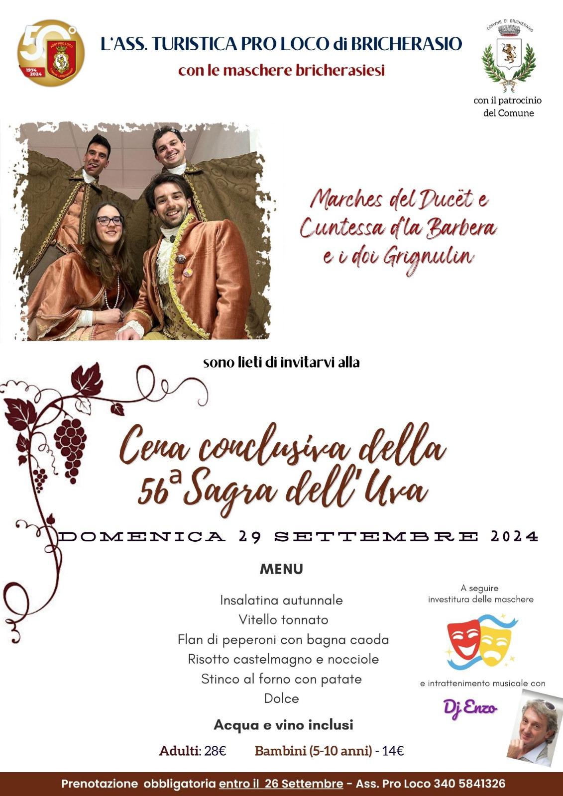 L'Associazione Turistica Pro Loco con le maschere bricherasiesi Marches del Ducet e Cuntessa d'la Barbera e i doi Grignulin invitano tutti a partecipare alla cena conclusiva della 56^ Sagra dell'Uva prevista per Domenica 29 settembre al PalaUva, in Piazza Castelvecchio. Il costo di partecipazione è fissato in 28 € per gli adulti mentre i bimbi dai 5 ai 10 anni pagano 14 €. Prenotazioni obbligatorie all'Associazione Turistica Pro Loco di Bricherasio al n.340.5841326.