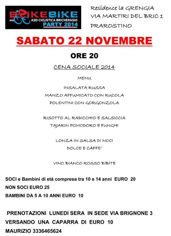 L’Associazione Ciclistica Brike Bike di Bricherasio si ritrova come ogni anno per i saluti di fine stagione e visto l’aumento della famiglia per poter accogliere soci, atleti simpatizzanti e chiunque vuole unirsi alla festa organizza per sabato 22 novembre alle ore 20 la cena sociale di fine attività annuale presso il ristorante “La Grengia” di Prarostino. Si invitano gli interessati a presentarsi, presso la sede del Brike Bike in Via Brignone, 3 il lunedì sera, versando una caparra di 10 €. Per maggiori informazioni rivolgersi a Maurizio al 333/6465624. Il costo è di 20 € e per i non tesserati di 25 €, per i bambini da 5 a 10 anni costa 10 euro.
