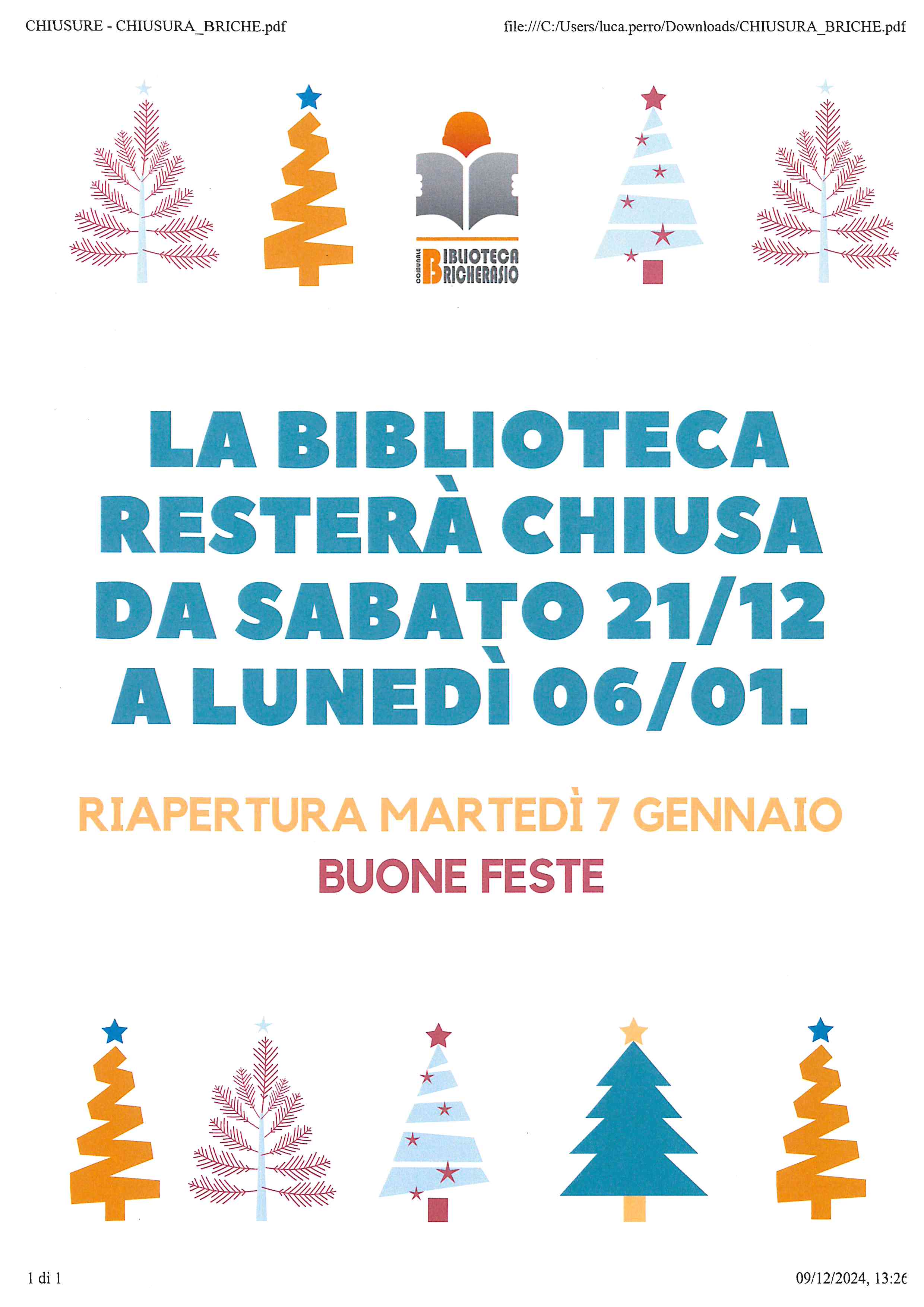 Si comunica che la biblioteca comunale di Bricherasio di Via Vittorio Emanuele II, 79/b resta chiusa per le ferie natalizie da sabato 21 dicembre a lunedì 6 gennaio 2025. Si riprende l’attività martedì 7 gennaio dalle 16 alle 18 che prosegue nello stesso orario tutti i giorni della settimana fino al venerdì. Giovedì apertura anche la mattina dalle 10 alle 12, mentre per comunicare con i volontari utilizzare l’email biblioteca.bricherasio@gmail.com e ricordiamo che la biblioteca è presente su facebook.
