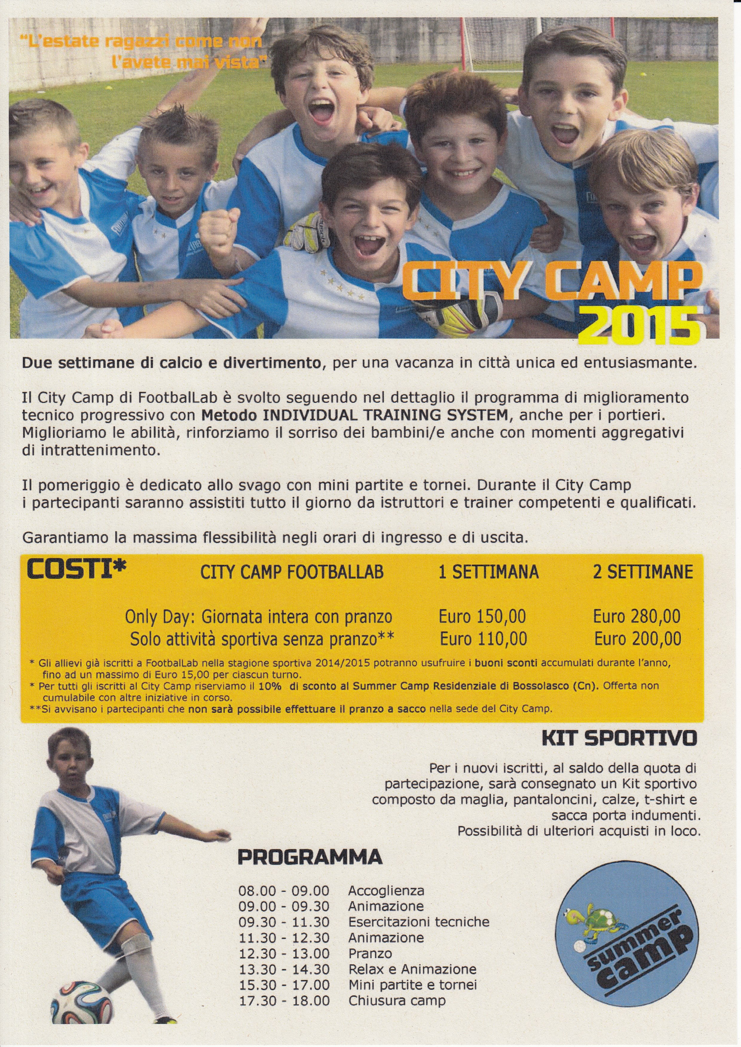 L’A.S.D. Bricherasio-Bibiana per trascorrere un’estate indimenticabile organizza “FootbalLab”, un city camp per ragazzi e ragazze dai 5 ai 13 anni per due settimane di calcio e divertimento. Le attività del summer camp cominciano lunedì 15 giugno con il primo turno per terminare venerdì 19 giugno mentre la settimana successiva, il 22 giugno, inizia il secondo campo mentre venerdì 1 maggio dalle ore 10 alle 18 c’è l’open day presso gli impianti sportivi di Bricherasio ad ingresso gratuito per vivere l’anteprima di questa incredibile estate ragazzi. Il costo per una settimana di una giornata intera con pranzo è di 150 € e per l’attività sportiva senza pranzo di € 110. Per gli iscritti al saldo della quota di partecipazione verrà consegnato un kit sportivo composto da maglia, pantaloncini, calze, t-shirt e sacca porta indumenti. L’iscrizione confermata con un acconto di 50 € deve pervenire entro venerdì 15 maggio direttamente al campo “Guido Calleri” di Via De Gregorio di Sant’Elia, 29 a Bricherasio oppure inviando la scheda d’iscrizione e la documentazione via email a footballab.segreteria@gmail.com e la quota si può pagare mediante assegno, bonifico oppure in contanti. Il bonifico si deve intestare a ASD Sportalent, Iban IT92L0335901600100000112307 indicando nella causale cognome, nome del partecipante, camp di Bricherasio e turno scelto. I documenti necessari richiesti sono la carta d’identità, una fototessera, il tesserino sanitario, il certificato di vaccinazione con richiamo antitetanico e antidifterico, autocertificazione alle intolleranze ed allergie e il certificato di idoneità sportiva. La struttura bricherasiese ha un campo da calcio a 11 in erba naturale, un campo di calcio a 5 in erba sintetica e un campo da beach volley/soccer oltre ad un fornitissimo bar. Per maggiori informazioni contattare i seguenti numeri 347/6676567 oppure 347/3811936.