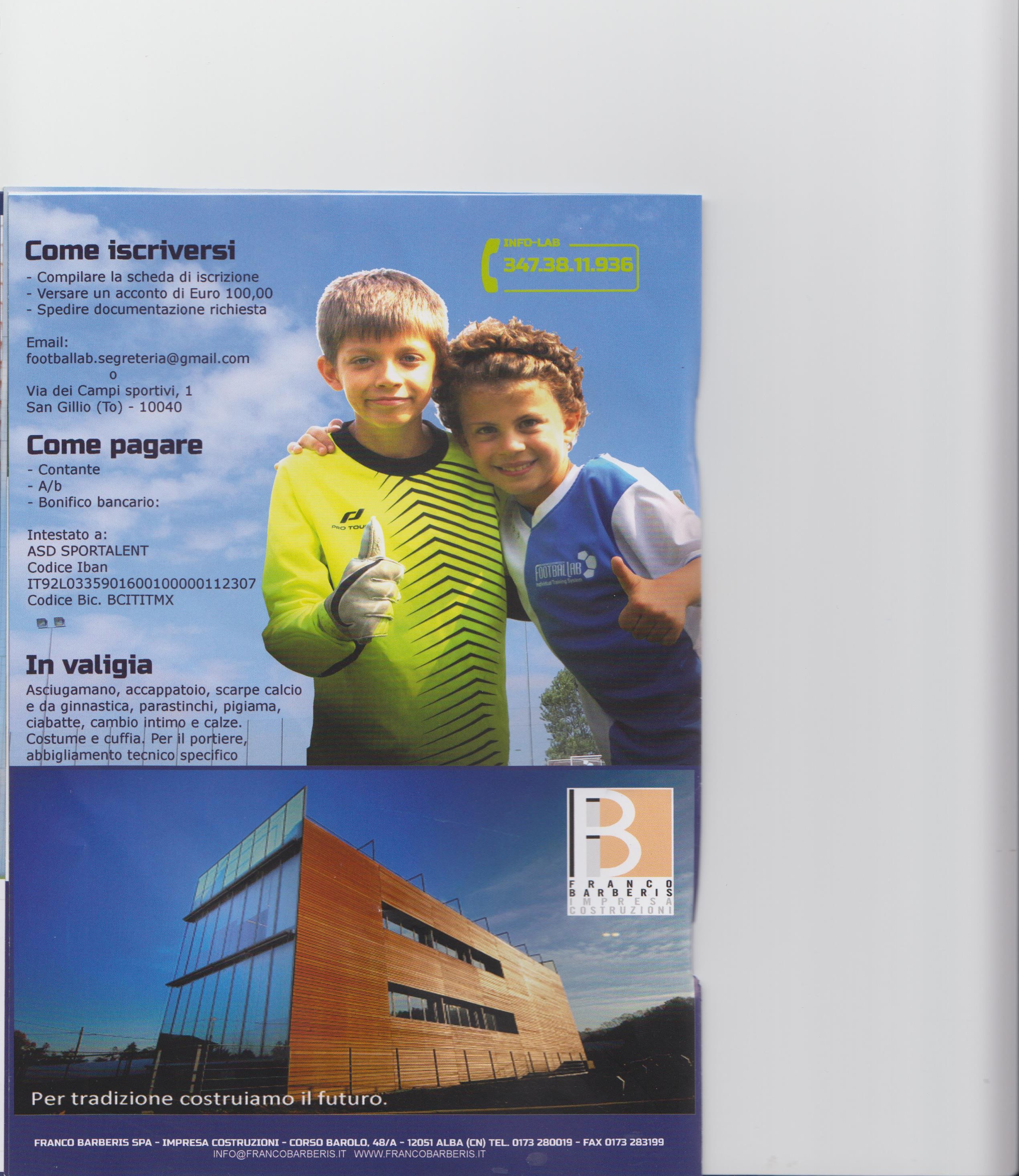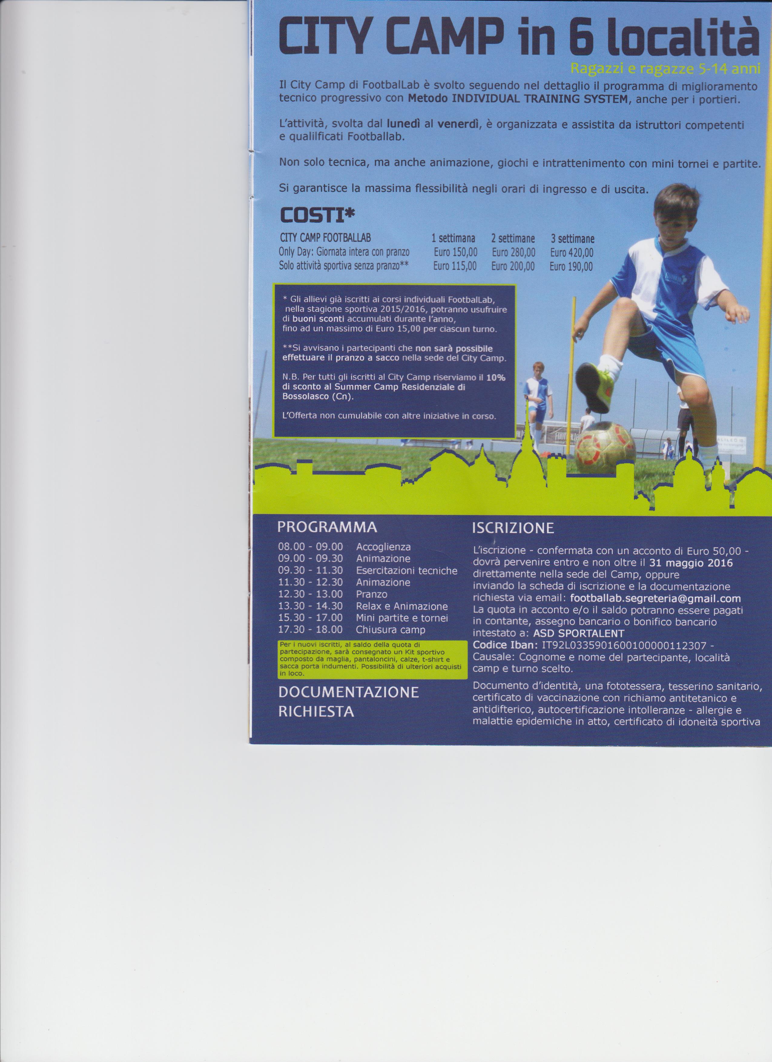 L’A.S.D. Bricherasio-Bibiana per trascorrere un’estate indimenticabile organizza “FootbalLab”, un City camp per ragazzi e ragazze dai 5 ai 17 anni per una settimana di calcio e divertimento. Le attività del summer camp cominciano lunedì 20 per terminare venerdì 24 giugno presso gli impianti sportivi di Bricherasio di Via De Gregorio di Sant’Elia, 29 per vivere questa incredibile estate ragazzi. Il programma del giorno parte alle ore 8 con l’accoglienza dei partecipanti, alle 9 animazione a cui seguono le esercitazioni tecniche dalle 9,30 alle 11,30. Prima del pranzo previsto alle 12,30 altra ora di animazione. Nel pomeriggio dopo il relax, mini partite e tornei prima della chiusura del camp prevista alle 18,00. Comunque è garantita la massima flessibilità negli orari. Il costo per la settimana della giornate intera con pranzo è di 150 € e per l’attività sportiva senza pranzo di € 115. Per i nuovi iscritti al saldo della quota di partecipazione verrà consegnato un kit sportivo composto da maglia, pantaloncini, calze, t-shirt e sacca porta indumenti. L’iscrizione confermata con un acconto di 50 € deve pervenire entro martedì 31 maggio direttamente agli impianti sportivi a Bricherasio oppure inviando la scheda d’iscrizione e la documentazione via email a footballab.segreteria@gmail.com e la quota si può pagare mediante assegno, bonifico oppure in contanti. Il bonifico si deve intestare a ASD Sportalent, Iban IT92L0335901600100000112307 indicando nella causale cognome, nome del partecipante e camp di Bricherasio. Ai partecipanti verrà consegnato un kit sportivo composto da maglia, pantaloncini, calze, t-shirt e sacca porta indumenti. La struttura bricherasiese ha un campo da calcio a 11 in erba naturale, un campo di calcio a 5 in erba sintetica e un campo da beach volley/soccer oltre ad un fornitissimo bar. Per maggiori informazioni contattare i seguenti numeri 347/6676567 oppure 347/3811936.