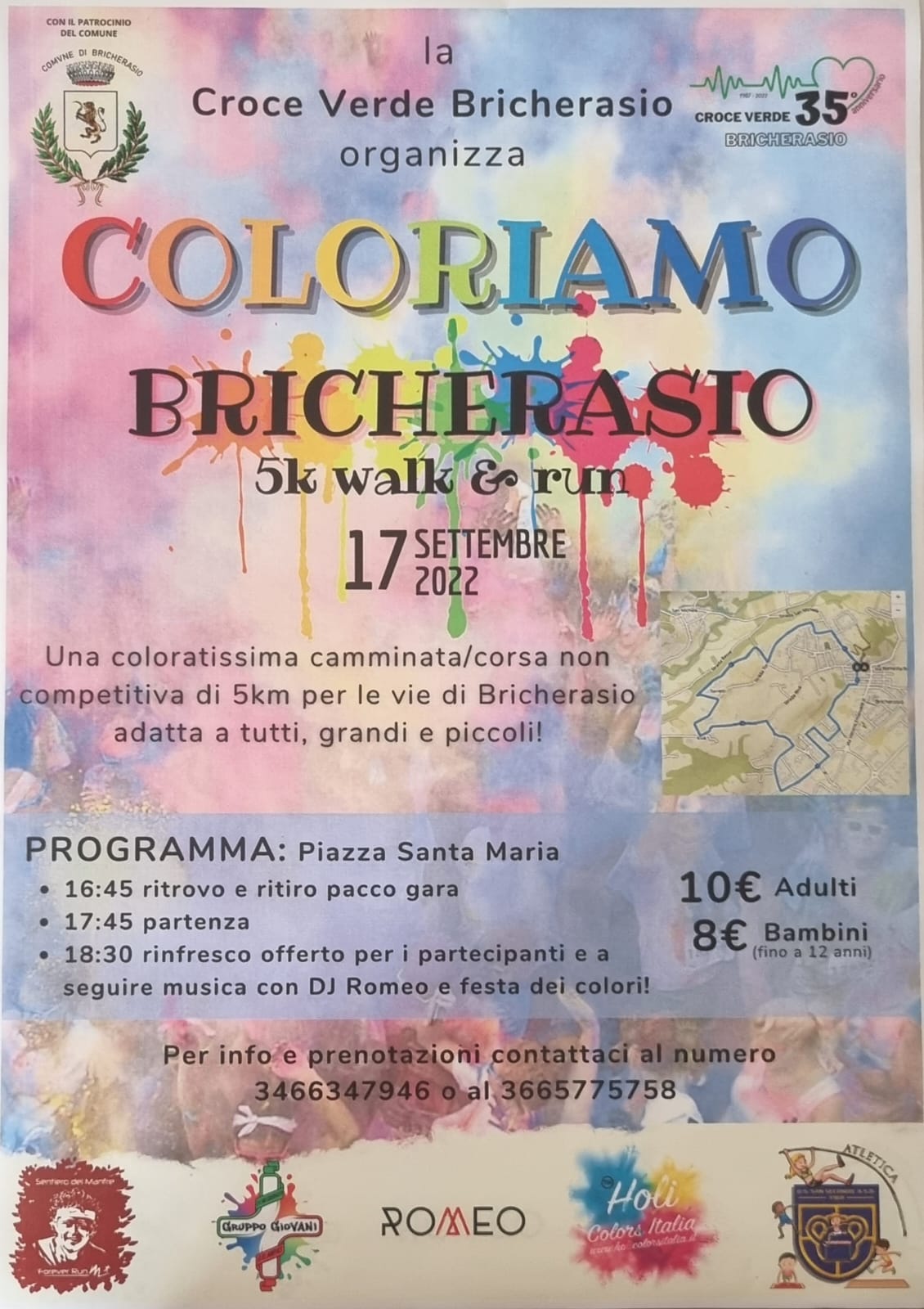 Sabato 17 settembre nuova iniziativa promossa dalla Croce Verde locale che per festeggiare I 35 anni di attività al servizio della comunità organizza una coloratissima camminata non competitiva tra le vie di Bricherasio dove saranno consegnati ai partecipanti una maglietta e una bustina di colori al costo di 10 euro (bimbi fino ai 12 anni euro 8). Per partecipare a "Coloriamo Bricherasio" ritrovo alle 16,45 in Piazza Santa Maria per le iscrizioni ed al termine Holi party con dj Romeo e servizio bar. Maggiori inforrmazioni ai numeri 346/6347946 oppure 366/5775758.