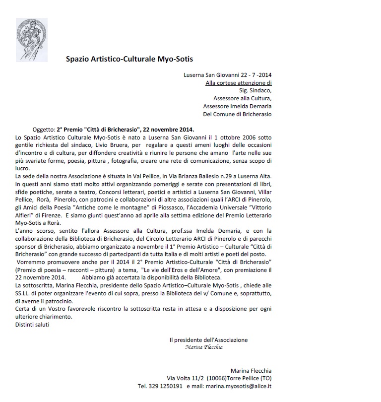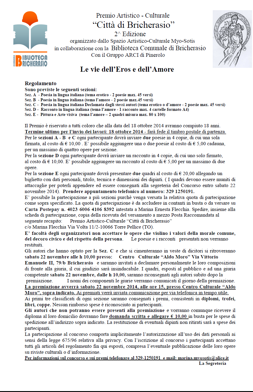 Concorso di poesia, racconti, pittura "Le vie dell'eros e dell'amore" organizzato dallo Spazio Artistico Culturale Myo-Sotis in collaborazione con il Comune di Bricherasio ed il Gruppo Arci di Pinerolo