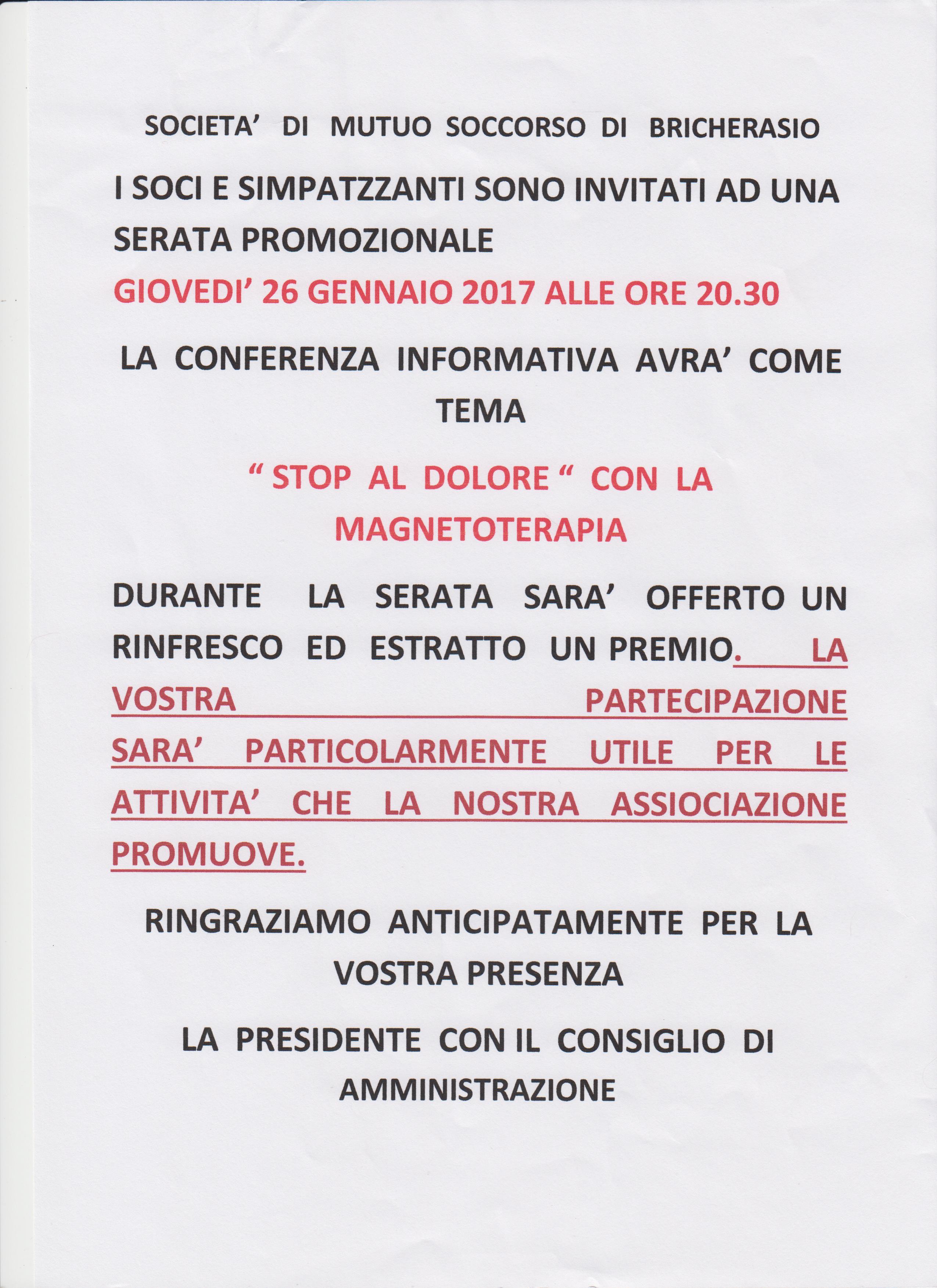La Società di Mutuo Soccorso di Bricherasio organizza per le ore 20,30 di giovedì 26 gennaio la conferenza informativa sul tema “Stop al dolore” con la magnetoterapia. Durante la serata sarà offerto il rinfresco e un premio a sorteggio. La partecipazione sarà particolarmente utile per le attività dell’Associazione bricherasiese.