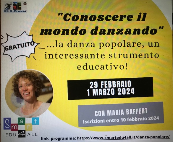 Il Centro Pedagogico di Danza e Cultura Popolare di Strada Avaro, 4 nella frazione di Cappella Merli a Bricherasio propone per giovedì 29 febbraio e venerdì 1 marzo l’evento gratuito “Conoscere il mondo danzando” con l'istruttrice Maria Baffert. Il programma è scaricabile sul sito www.smartedu4all.it e le iscrizioni scadono sabato 10 febbraio. Maggiori informazioni al numero 349/1815715.