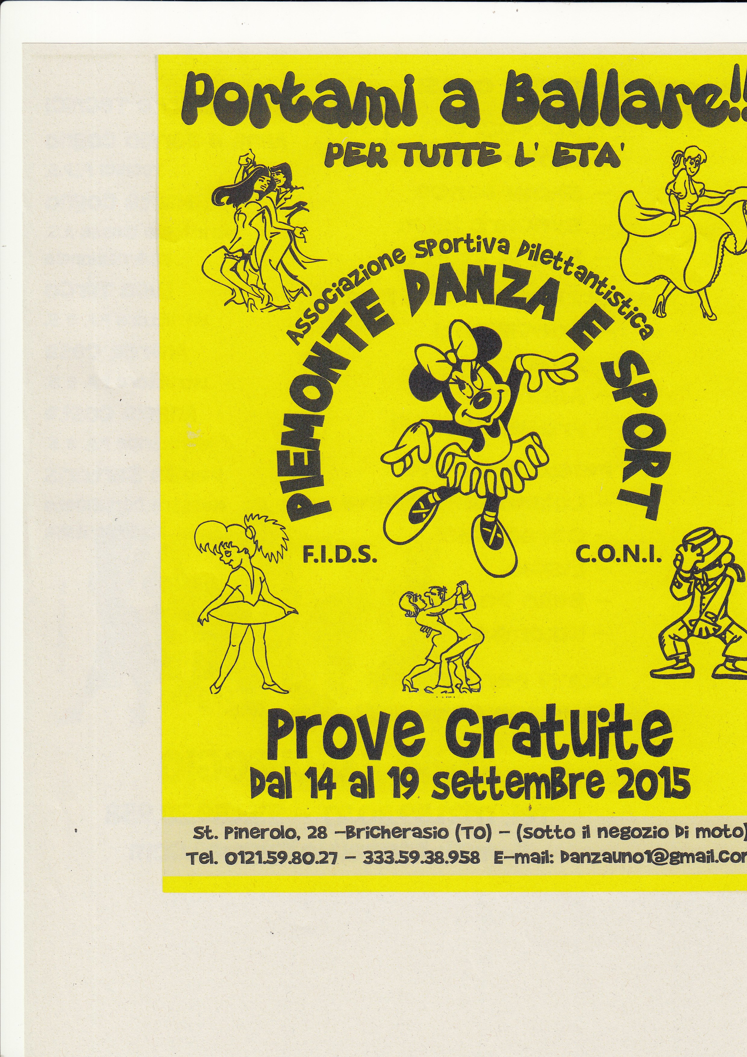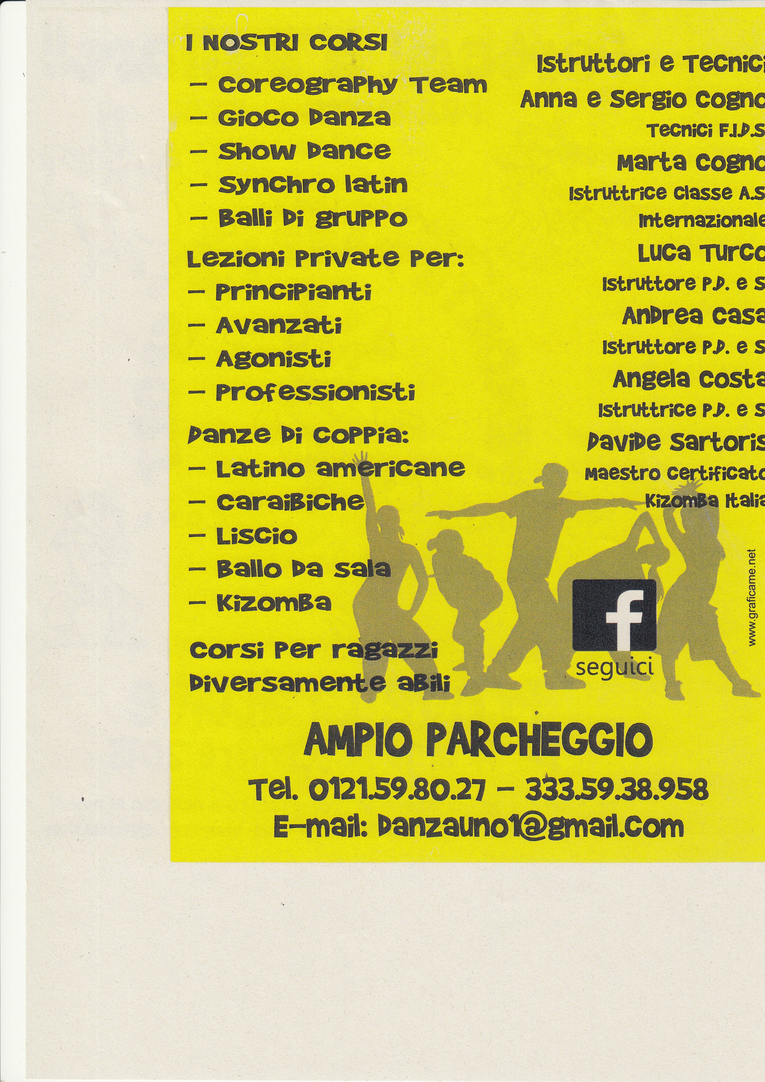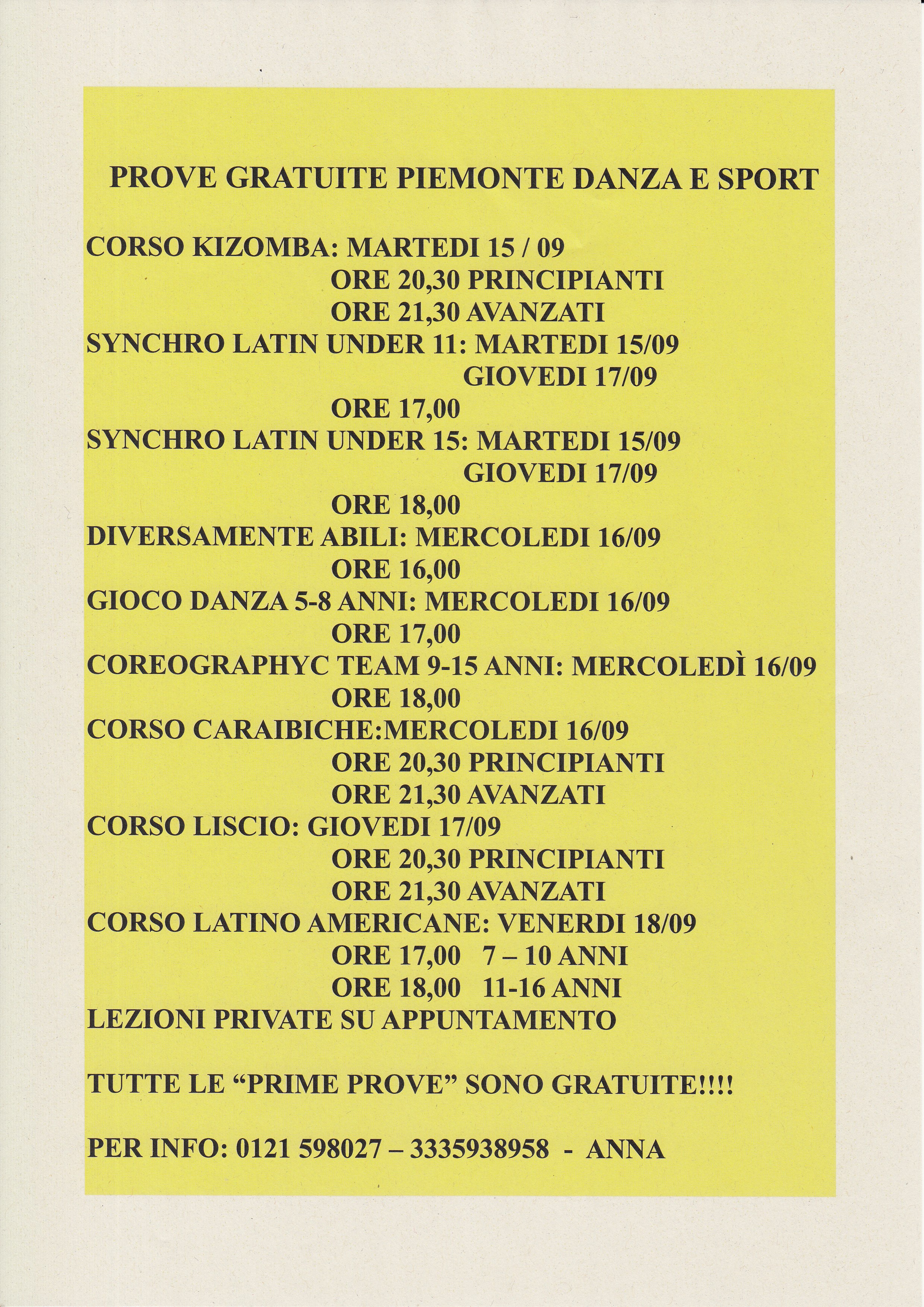A Bricherasio l’Associazione Sportiva Dilettantistica Piemonte Danza e Sport organizza dei corsi di ballo per tutte le età con prove gratuite da lunedì 14 a sabato 19 settembre. I corsi sono di coreography team per i giovani dai 9 ai 15 anni (inizio mercoledì 16 ore 18), gioco danza per i piccoli dai 5 agli 8 anni (mercoledì 16 alle 17), synchro latin under 11 (martedì 15 e giovedì 17 ore 17) e under 15 (alle 18 di martedì 15 e giovedì 17) e balli di gruppo e si tengono lezioni private per principianti, avanzati, agonisti e professionisti. Per le danze di coppia corsi di latino-americano (venerdì 18 alle ore 17 per i ragazzi dai 7 ai 10 anni e alle 18 per quelli dagli 11 ai 16 anni), caraibiche (mercoledì 16 alle 20,30 per i principianti e alle 21,30 gli avanzati), liscio (giovedì 17 ore 20,30 i principianti e 21,30 gli avanzati), e kizomba (martedì 15 alle 20,30 per i principianti e alle 21,30 gli avanzati) e pure per ragazzi diversamente abili previsti corsi specifici con istruttori e tecnici qualificati mercoledì 16 alle ore 16. Le lezioni, anche private su appuntamento, si svolgono in Stradale Pinerolo, 28 a Bricherasio e per maggiori informazioni telefonare ai numeri 0121/598027 oppure 333/5938958. Le prime prove sono gratuite.