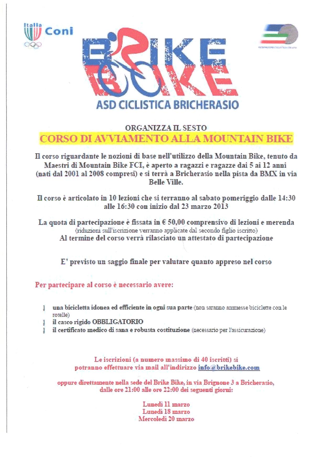 L’Associazione Ciclistica Bricherasio organizza il sesto corso di avviamento alla mountain bike tenuto da maestri della Federazione e destinato a ragazzi e ragazze dai 5 ai 12 anni e si tiene nella pista bmx di Via Belleville a Bricherasio. Il corso in dieci lezioni articolate nell’uso della mountain bike si svolgono il sabato dalle ore 14,30 alle 16,30 con inizio previsto per sabato 23 marzo. La quota di partecipazione è di 50,00 € comprensivo di lezioni e merenda con riduzioni per più figli iscritti e per partecipare occorre essere muniti di casco, bicicletta e certificato medico di idoneità all’attività sportiva agonistica. Al termine verrà rilasciato un attestato di partecipazione. In previsione un saggio finale per valutare le nozioni apprese nel corso. Per informazioni ed iscrizioni rivolgersi nella sede dell’Associazione Ciclistica in Via Brignone 3 lunedì 18 e mercoledì 20 marzo dalle ore 21.00 alle 22,00 oppure sul sito info@brikebike.com inviando un’e-mail allo stesso indirizzo di posta elettronica.