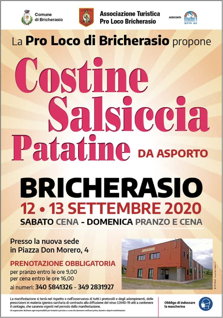 La Pro Loco di Bricherasio propone per la sera di sabato 12 presso la propria sede di Piazza Don Morero 4 una cena da asporto (previa prenotazione telefonica ai numeri 340/5841326 e 349/2831927) a base di costine, salsiccia e patatine. Domenica 13 settembre la distribuzione comincia a pranzo e si deve prenotare il pasto entro le ore 9 mentre per le cene del weekend si accettano prenotazioni fino alle ore 16.