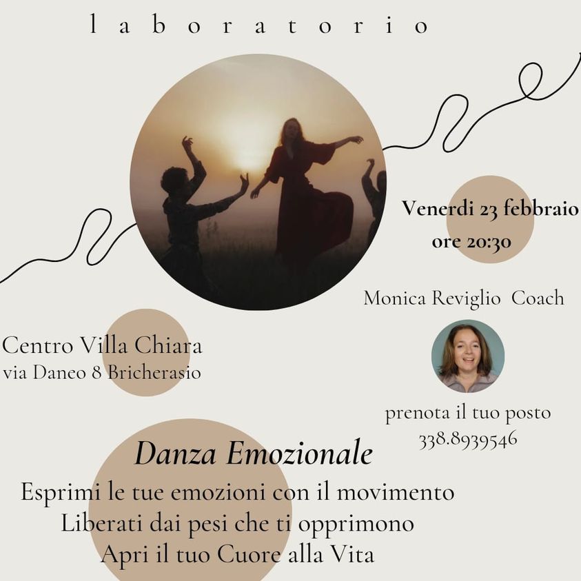 Marisa Bocco, Elisa Limone e Federica Solera responsabili di Villa Chiara, centro per incontri, attività varie e laboratori ubicato in Via Daneo, 8 a Bricherasio stanno predisponendo il consueto e ricco programma di attività per il 2024, e dopo aver celebrato il Carnevale con gli immancabili laboratori per bambini ora la stessa Associazione bricherasiese organizza un laboratorio per adulti di Danza Emozionale. Venerdì 23 febbraio a partire dalle ore 20,.30 i partecipanti potranno esprimere le proprie emozioni con il movimento, liberarsi dai pesi che opprimono aprendo il cuore alla vita con la coach Monica Reviglio. Per maggiori informazioni e prenotazioni telefonare al numero 338/8939546.