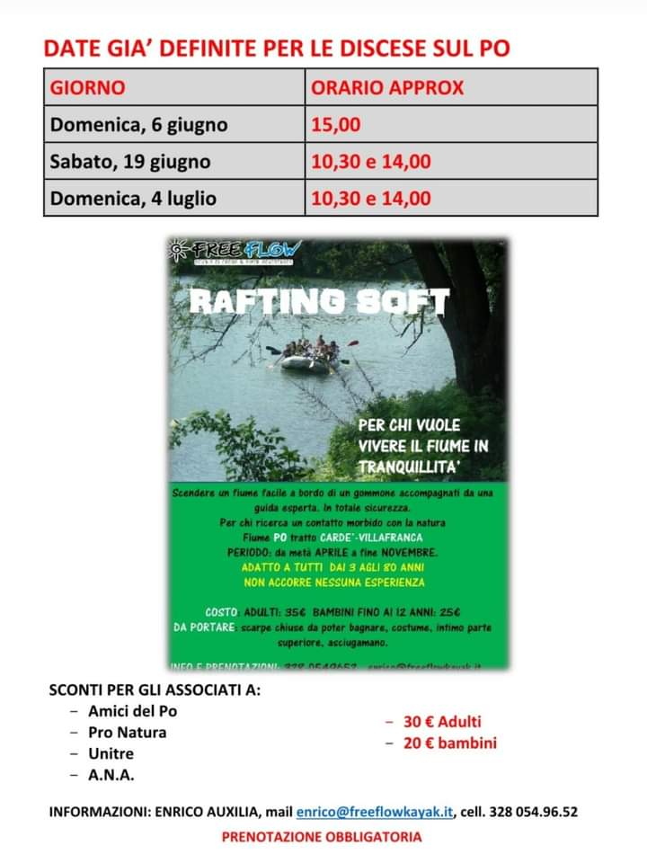 L'Unitre di Bricherasio chiude l’anno accademico 2021/21 senza essere riusciti a partire in presenza causa pandemia ma si è cercato di mantenere l’interesse con alcuni corsi proposti on-line. La Presidente Annamaria Garzena ammette “Siamo consapevoli che non è la stessa cosa, che pochi associati hanno aderito per svariati motivi ma era l’unico modo per essere presenti, per far passare un messaggio di fiducia e per far sapere che noi eravamo attivi. Questo tentativo è stato un metodo per ringraziare chi ha creduto in noi ad inizio anno e riteniamo giusto che tutti coloro che si sono iscritti all’anno corrente che volge al termine saranno iscritti gratuitamente all’anno accademico 2021/22”. Adesso l’associazione propone una serie di discese in gommone sul Pò da Cardè a Villafranca, di livello 1 quindi adatta a tutti, organizzata dalla scuola di canoa Freeflow gestita dal maestro di kayak Francesco Salvato che opera nel campo scuola al laghetto Badariotti di Bricherasio e già conosciuto durante le proiezioni all’Unitre bricherasiese delle sue discese spettacolari nei 5 continenti. L'ultimo appuntamento rimanente per il rafting è per Domenica 4 luglio, la mattina alle 10,30 e il pomeriggio alle 14. Per gli associati e simpatizzanti Unitre il costo è di 30 euro a persona e 20 euro per i bambini. Per prenotazioni inviare una email a unitrebricherasio@gmail.com con nome, cognome, data e orario prescelti e recapito telefonico.