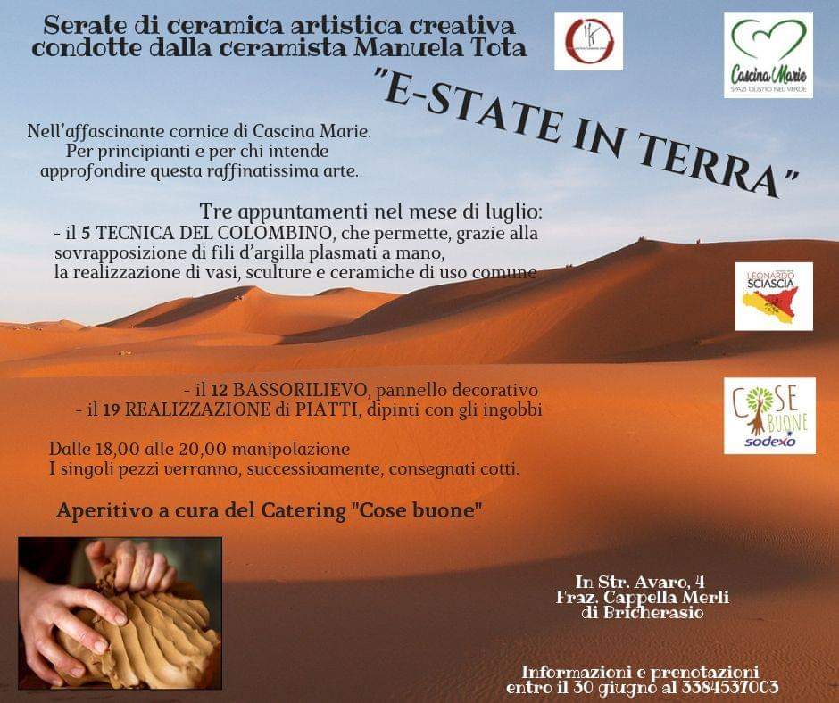 Nell’affascinante cornice di Cascina Marie in Strada Avaro, 4 nella frazione Cappella Merli a Bricherasio l’Associazione Leonardo Sciascia in collaborazione con la Sodexo e Cascina Marie organizzano tre appuntamenti nel mese di luglio dal titolo “E-state in terra”, serate di ceramica artistica creativa condotte dalla ceramista Manuela Tota. Lo stage sulla creta, passando all’attività manipolativa vera e propria permette di esplorare un materiale nuovo, consente di inventare e scoprire forme nuove di progettazione, finalizzare l’uso controllato della mano e ristabilire il rapporto tra mani e intelligenza. Gli incontri, dalle ore 18 alle 20, cominciano venerdì 5 con la tecnica del colombino che permette, grazie alla sovrapposizione di fili d’argilla plasmati a mano, la realizzazione di vasi, sculture e ceramiche di uso comune. Venerdì 12 si crea il pannello decorativo con le regole del bassorilievo. Ultima serata venerdì 19 dove si realizzano piatti e dipinti con gli ingobbi. Le singole creazioni verranno successivamente consegnate cotte. Per informazioni e prenotazioni telefonare al numero 338/4537003.
