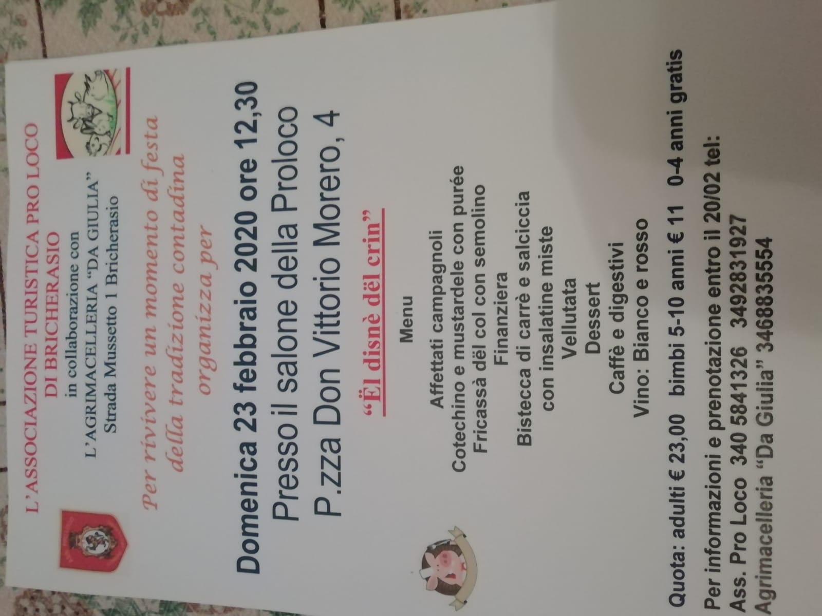 La Pro Loco di Bricherasio per rivivere una festa della tradizione contadina organizza, in collaborazione con l’Agrimacelleria “Da Giulia” di Bricherasio, per Domenica 23 febbraio alle ore 12,30 nel Salone della Pro Loco “El disnè del crin”. La quota di partecipazione per gli adulti è di 23,00 €, per i bambini dai 5 ai 10 anni di 11,00 €. Per informazioni e prenotazioni telefonare entro giovedì 20 febbraio ai numeri 340/5841326, 349/2831927 oppure 346/8835554.