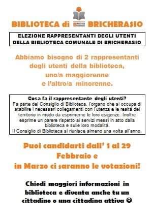 La Biblioteca Comunale di Bricherasio deve eleggere nel mese di marzo due rappresentanti degli utenti, uno maggiorenne e l’altro minorenne, che faranno parte del consiglio di biblioteca. Tutti si possono candidare presentando domanda in Biblioteca in Via Vittorio Emanuele II, 79/B entro sabato 29 febbraio. Si ricorda che la sala lettura bricherasiese è aperta dal lunedì al venerdì dalle ore 16 alle 18 ed il giovedì e sabato mattina dalle 10 alle 12.