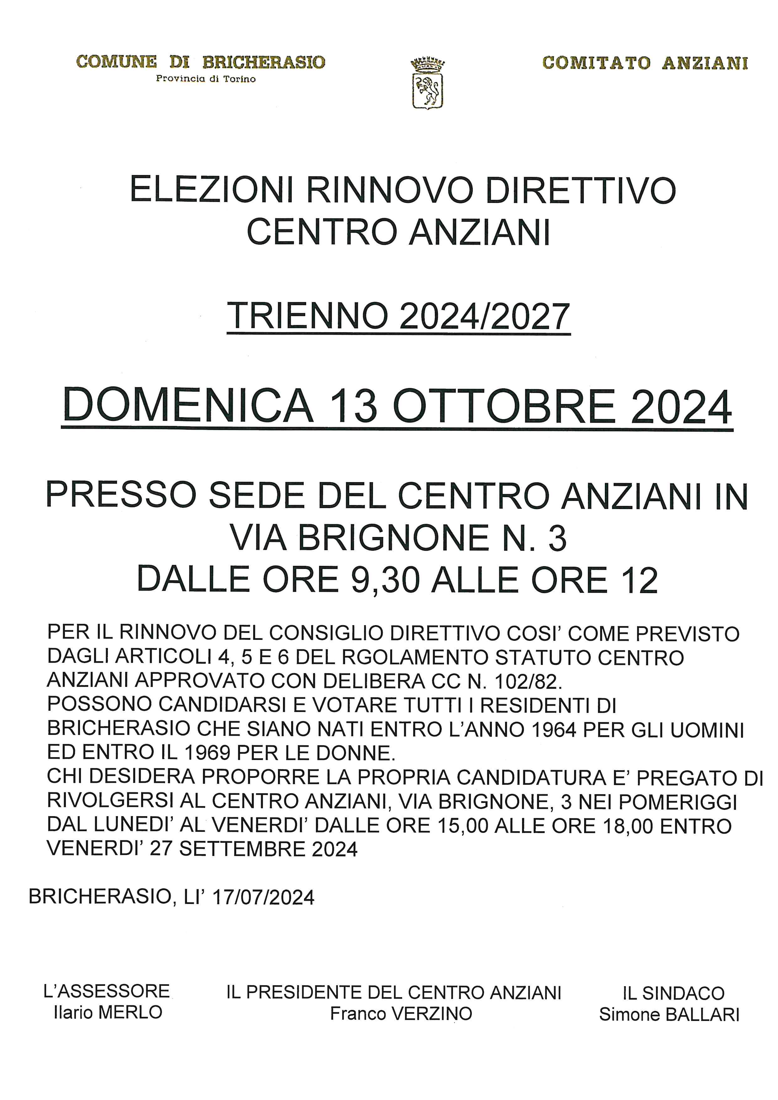 Il Centro Anziani di Bricherasio indice le elezioni per il rinnovo del proprio direttivo per il triennio 2024/2027. Domenica 13 ottobre presso la sede di Via Brignone, 3 dalle ore 9,30 alle 12, i residenti di Bricherasio che siano nati entro il 1964 per gli uomini ed entro il 1969 per le donne possono presentarsi alle urne e votare. Per proporre la propria candidatura e maggiori informazioni rivolgersi in sede nei pomeriggi dalle ore 15 alle 18 dal lunedì al venerdì.
