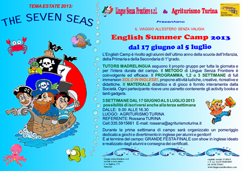 Le iscrizioni al viaggio all’estero senza valigia “English summer camp” devono pervenire entro venerdì 24 maggio 2013, contattando l’agriturismo Turina di Bricherasio al numero 335-5915661". "Dal 17 giugno al 5 luglio presso il medesimo agriturismo bricherasiese, inizia il corso di inglese rivolto ai bambini dai 6 ai 12 anni che saranno seguiti da Tutors madrelingua per tutta la giornata e per l’intera durata del campo. Il programma di una, due o tre settimane di full immersion propone attività ludiche, creative, ricreative e didattiche. Ogni partecipante riceve uno zainetto contenente gli activity books e tanti gadgets Durante il campo viene offerta alle famiglie che lo desiderano l’opportunità di vivere così una interessante esperienza culturale ospitando un tutor ed è una bellissima sperimentazione sia per le famiglie che per i tutors che sono interessati a conoscere e vivere la quotidianità italiana; tanto che l’iniziativa ha ottenuto il patrocinio del Comune di Bricherasio.