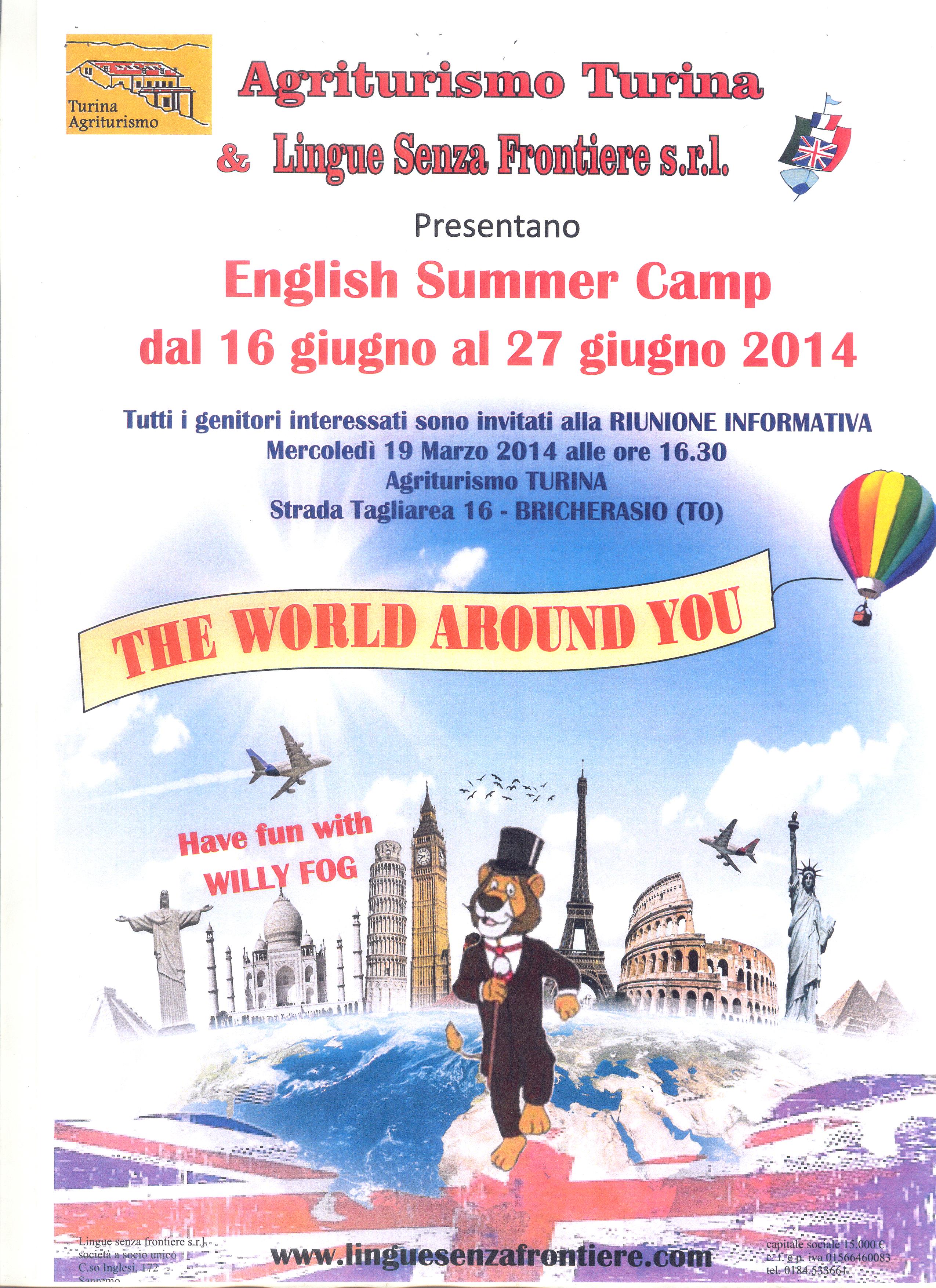 La riunione informativa del viaggio all’estero senza valigia “English summer camp” si tiene mercoledì 19 marzo 2014, alle ore 16,30 all’agriturismo Turina di Bricherasio. "Dal 16 al 27 giugno presso il medesimo agriturismo bricherasiese, in Strada Tagliarea, 16 inizia il corso di inglese rivolto ai bambini dai 6 ai 12 anni che saranno seguiti da Tutors madrelingua per tutta la giornata e per l’intera durata del campo. Il programma di dieci giorni di full immersion propone attività ludiche, creative, ricreative e didattiche. Ogni partecipante riceve tanti gadgets e durante il campo viene offerta alle famiglie che lo desiderano l’opportunità di vivere così una interessante esperienza culturale ospitando un tutor ed è una bellissima sperimentazione sia per le famiglie che per i tutors che sono interessati a conoscere e vivere la quotidianità italiana. Info al numero 335-5915661