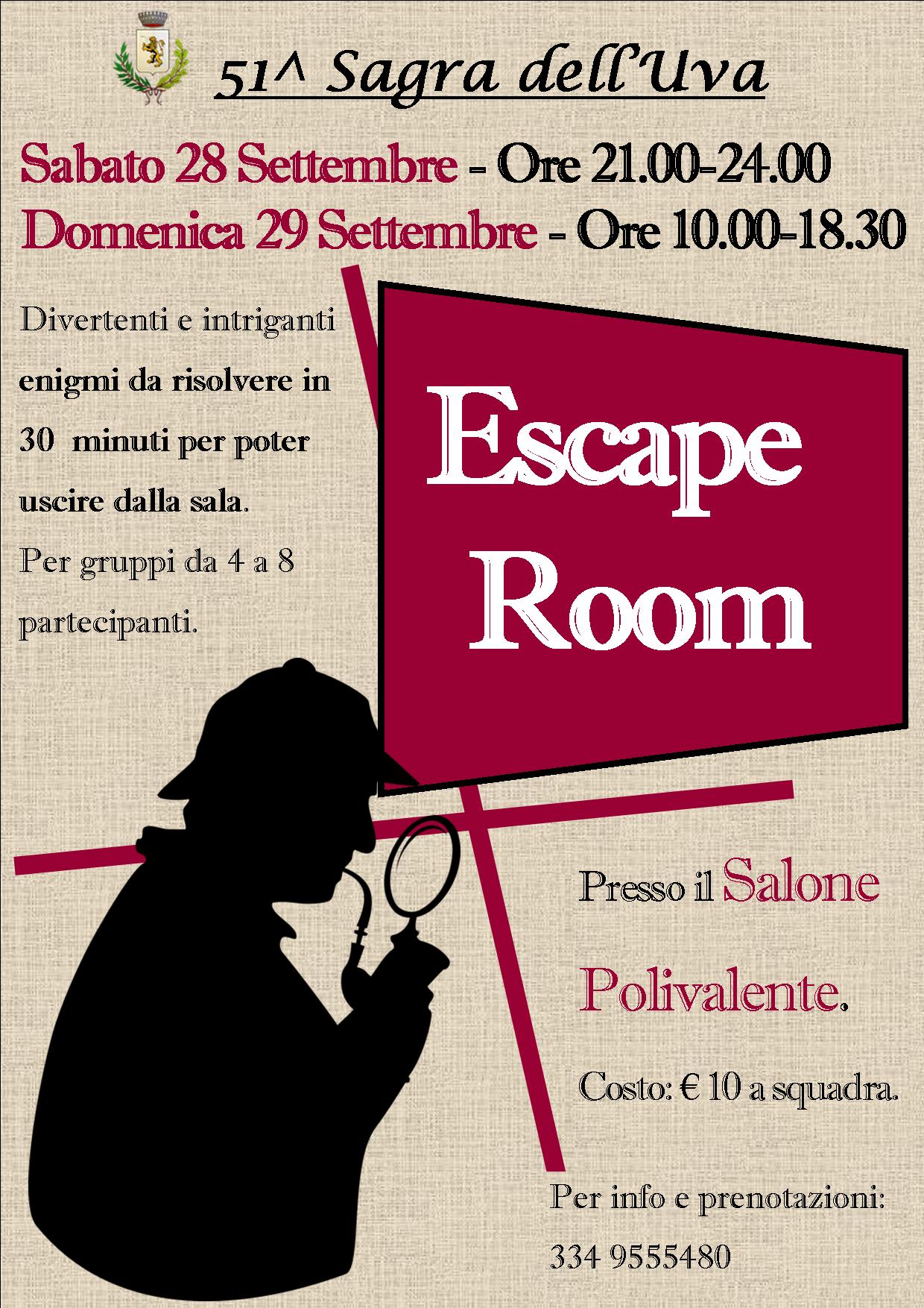 Dalle ore 21.00 alle 24 di sabato 28 e dalle 10 alle 18,30 di Domenica 29 settembre presso il Salone Polivalente di Piazza Don Morero. Enigmi da risolvere in 20 minuti per poter uscire dalla sala. Coinvolgente, intrigante e divertente gioco di squadra per gruppi da 4 a 8 partecipanti. Costo: € 10 a squadra. Informazioni e prenotazioni da Federica al 334-9555480.