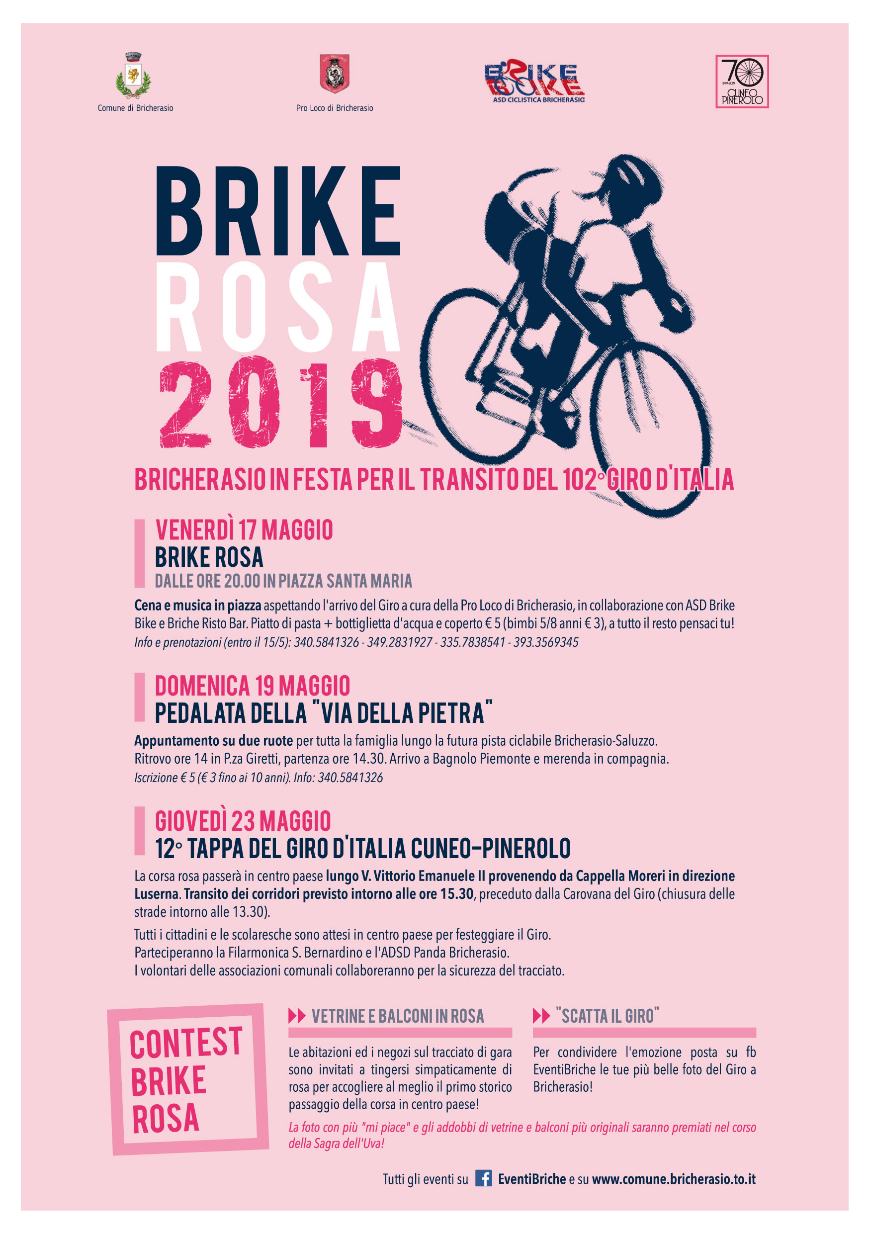 Ecco il programma completo degli eventi per il passaggio del 102° Giro d'Italia a Bricherasio: Brike rosa, la cena al Salone Polivalente in Piazza Don Morero (venerdì 17/5), la Pedalata della "Via della pietra" (domenica 19/5 per coinvolgere tutti i comuni di quella che presto sarà la nuova pista ciclabile Bricherasio-Saluzzo) e poi naturalmente il transito dei corridori e della carovana rosa (giovedì 23/5). Partecipa anche tu al contest per il miglior balcone e la migliore vetrina in rosa (con premiazione a settembre in occasione della Sagra dell'Uva) e posta sulla pagina fb ufficiale EventiBriche tutte le più belle foto dell'evento.