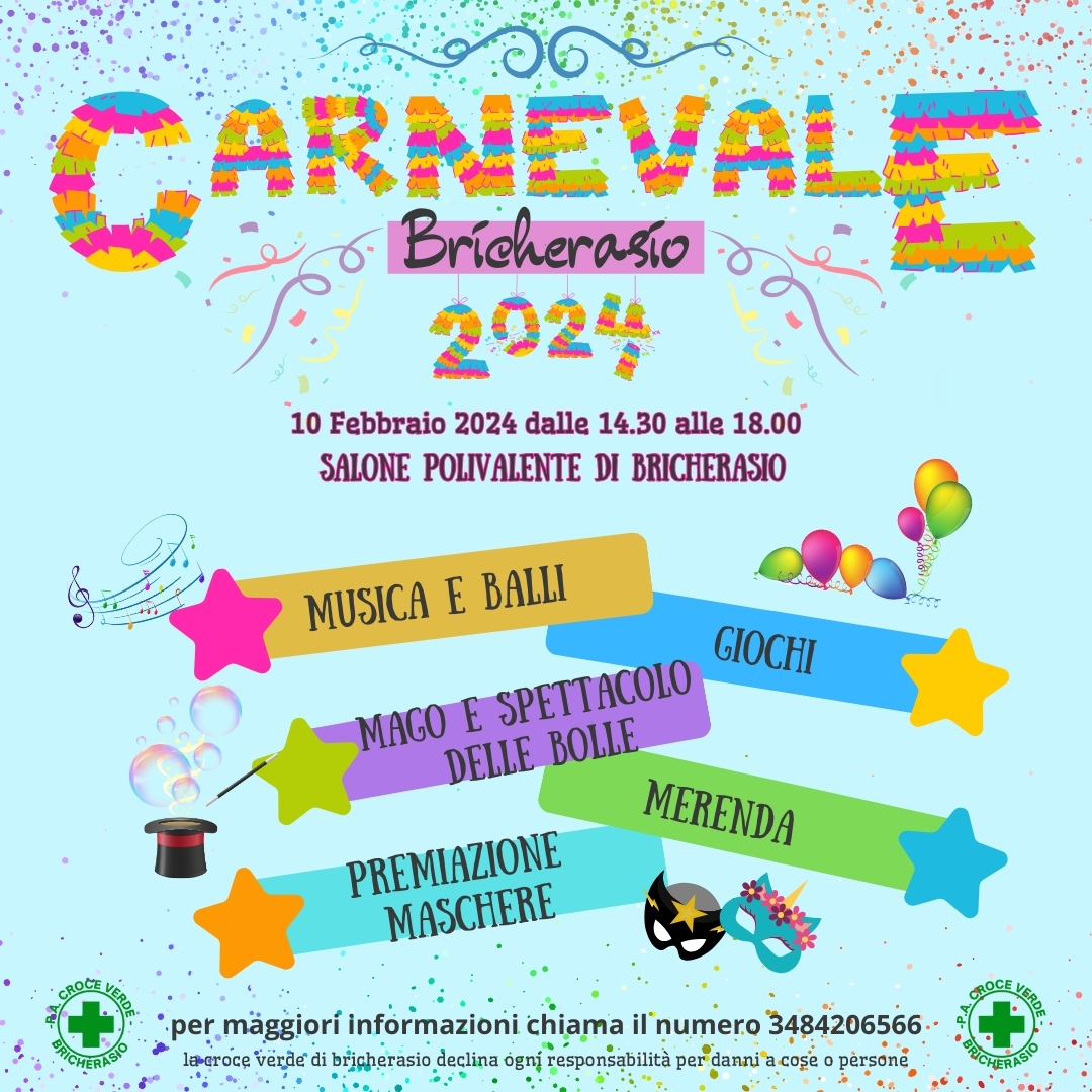 La Croce Verde di Bricherasio organizza per sabato 10 febbraio dalle ore 14,30 alle 18 la festa di carnevale in maschera al Salone Polivalente di Piazza Don Morero a Bricherasio. Spettacolo di magia con Daniel e quello di bolle proposto da Mister Paul poi musica, balli, giochi, premiazione delle maschere e merenda offerta a tutti i partecipanti. Per maggiori informazioni chiamare il numero 348/4206566.