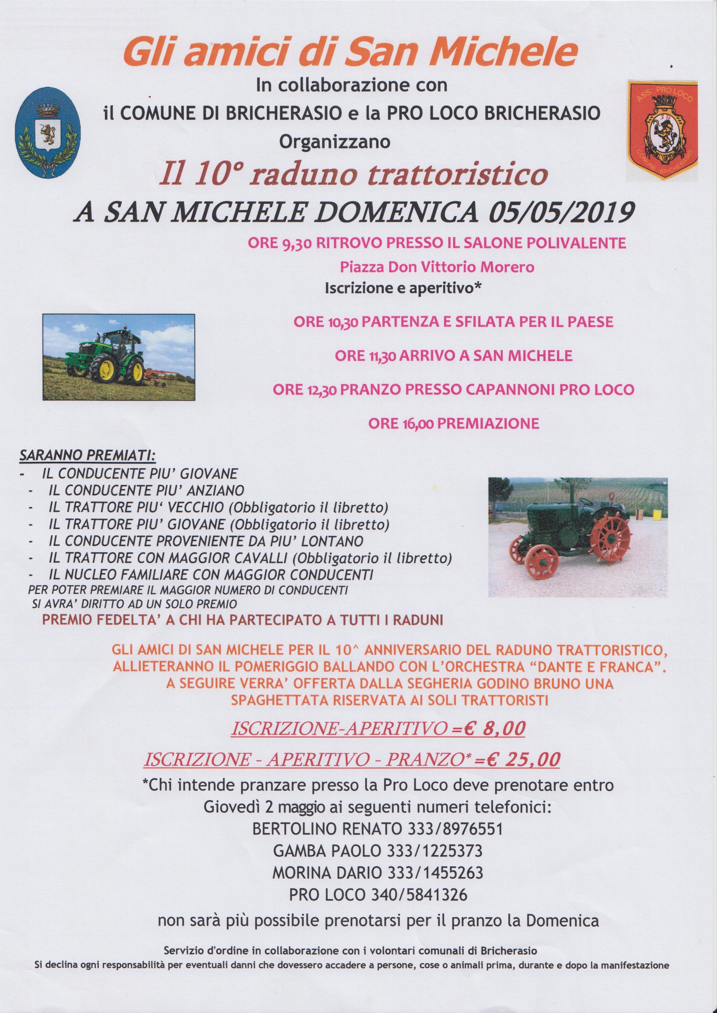 Gli "Amici di San Michele" in collaborazione con il Comune di Bricherasio e la Pro Loco di Bricherasio organizzano il 10° raduno trattoristico a San Michele per Domenica 5 maggio con il seguente programma: alle ore 9,30 il ritrovo al Salone Polivalente di Piazza Don Vittorio Morero per iscrizione e aperitivo, alle 10,30 la partenza per la sfilata per il paese e alle 11,30 è previsto l'arrivo nella frazione di San Michele. Alle ore 12,30 il pranzo nei capannoni della Pro Loco e alle 16 la premiazione del conducente più giovane e più anziano, del trattore più vecchio e più giovane ed è obbligatorio il libretto, il conducente proveniente da più lontano e il trattore con maggior numero di cavalli fiscali. Per poter premiare il maggior numero di conducenti si ha diritto ad un solo premio. Verrà consegnato il premio fedetà a chi ha partecipato a tutti e dieci i raduni. L'iscrizione all'aperitivo costa 8 € mentre con il pranzo 25 €. Chi intende pranzare presso la Pro Loco deve prenotare entro Giovedì 2 maggio ai seguenti numeri telefonici: Renato Bertolino 333/8976551, Paolo Gamba 333/1225373, Dario Morina 333/1455263 oppure Associazione Pro Loco Bricherasio 340/5841326 e non sarà più possibile prenotarsi per il pranzo la Domenica. GLI AMICI DI SAN MICHELE PER IL 10^ ANNIVERSARIO DEL RADUNO TRATTORISTICO, ALLIETERANNO IL POMERIGGIO BALLANDO CON L’ORCHESTRA “DANTE E FRANCA”. A SEGUIRE VERRA’ OFFERTA DALLA SEGHERIA GODINO BRUNO UNA SPAGHETTATA RISERVATA AI SOLI TRATTORISTI