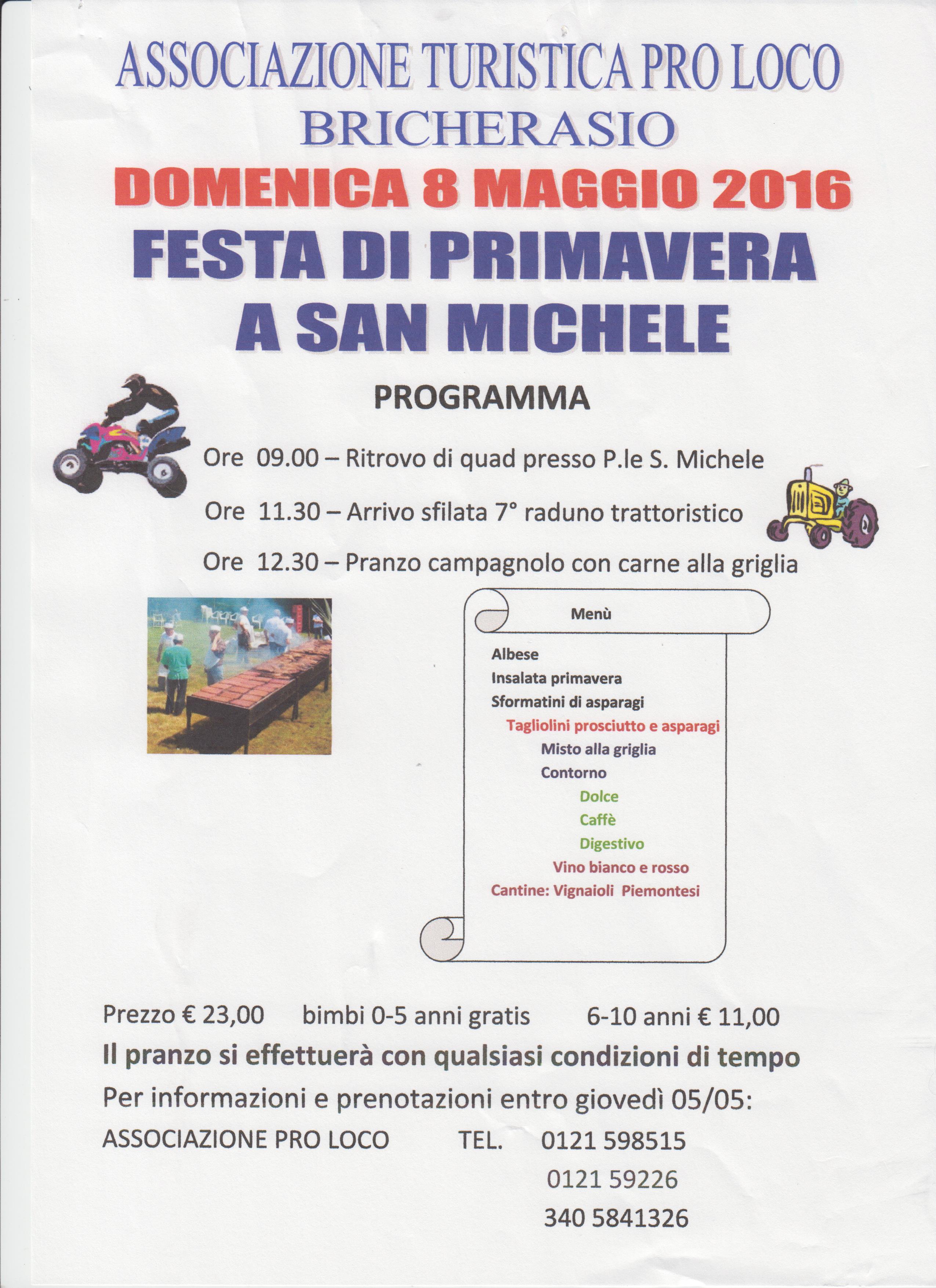 La Pro Loco di Bricherasio in collaborazione con il Comune e Gli amici di San Michele organizzano per Domenica 8 maggio nella frazione di San Michele di Bricherasio la popolare e consueta Festa di Primavera con il settimo Raduno Trattoristico, il ritrovo dei quad e l’immancabile pranzo campagnolo composto da un ricco menu di carne alla griglia preceduto da tre ottimi antipasti e dal primo e seguito da dolce, caffè e digestivo. Il programma prevede il ritrovo dei quad alle ore 9,00 presso il piazzale di San Michele e quello dei trattori alle 9,30 presso il Salone Polivalente di Piazza Don Morero per l’iscrizione e l’aperitivo. Alle 10,30 la partenza e la sfilata per il paese dei trattori. Alle 11,30 l’arrivo a San Michele per il pranzo che si effettuerà su prenotazione e con qualsiasi condizioni di tempo dato che si svolgerà sotto i capannoni della Pro Loco. Per iscriversi al convivio telefonare entro giovedì 5 maggio ai numeri di Bertolino 333/8976551, di Gamba 333/1225373 oppure alla Pro Loco al 340/5841326. Per l’iscrizione al raduno trattoristico con l’aperitivo il costo è di € 8,00, con il pranzo il prezzo è di 25,00 € entro giovedì 5 perché non sarà più possibile prenotarsi la Domenica solo per mangiare. Alle ore 16 la ricca premiazione dei partecipanti al raduno dove a tutti verrà consegnato un pacco omaggio e saranno gratificati ulteriormente il conducente più giovane, il più anziano, il trattore più anziano e quello più giovane, chi proviene da più lontano e il mezzo con maggior potenza in cavalli fiscali deducibile dal libretto.