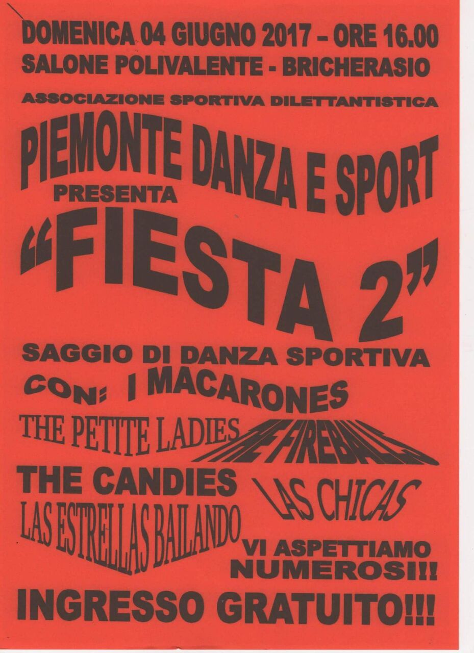 L’Associazione Piemonte Danza e Sport di Bricherasio presenta Domenica 4 giugno “Fiesta 2”, saggio di danza al Salone Polivalente di Piazza Don Morero a Bricherasio con ingresso gratuito a partire dalle ore 16 con I Macarones, The petite ladies, Las chicas, The candies, Las estrellas bailando e The fireballs. Il saggio è l’occasione per gli allievi di assaporare il piacere di danzare una coreografia in scena. Questo è il tempo di prove, esami e spettacoli. Il saggio di danza impegna, e a volte terrorizza, decine di bambine, ragazze, pochissimi ragazzi, insegnanti, genitori. Tutti concentrati sul mostrare quanto si è imparato e insegnato nei mesi scorsi: abilità, tecnica, creatività. Organizzare un saggio alla scuola di danza Piemonte Danza e Sport è molto impegnativo, prevede un percorso annuale con la realizzazione di coreografie e balletti di varia tipologia ma prevalgono emozioni, sorrisi e piacere di danzare. Perché la danza è l’unica vera fonte attraverso la quale si possono esprimere in libertà le proprie sensazioni, anche quelle che non si riesce a descrivere a parole. In ogni saggio, in ogni spettacolo è come se si ripetesse la magia del primo balletto. I preparativi, l’attesa dietro le quinte, i minuti che precedono l’entrata in scena, sono tesissimi. In quei pochi istanti la mente è in tilt, i mesi di lavoro, le ultime prove sembrano essersi volatilizzate, la salivazione si ferma, le gambe tremano, la paura aumenta, il cuore batte, batte all’impazzata.