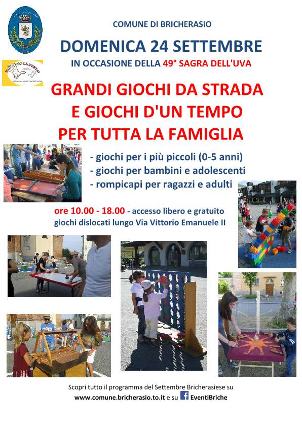 Il Comune di Bricherasio, all'interno della 49^ edizione della Sagra dell'Uva organizza per Domenica 24 settembre, a partire dalle ore 10, dei giochi da strada e giochi di un tempo per tutta la famiglia con accesso libero e gratuito. I giochi son divisi per fasce d'età partendo dai 0 ai 5 anni, poi si passa alla fascia adolescenziale e si arriva ai rompicapo per ragazzi ed adulti e sono dislocati lungo Via Vittorio Emanuele II.