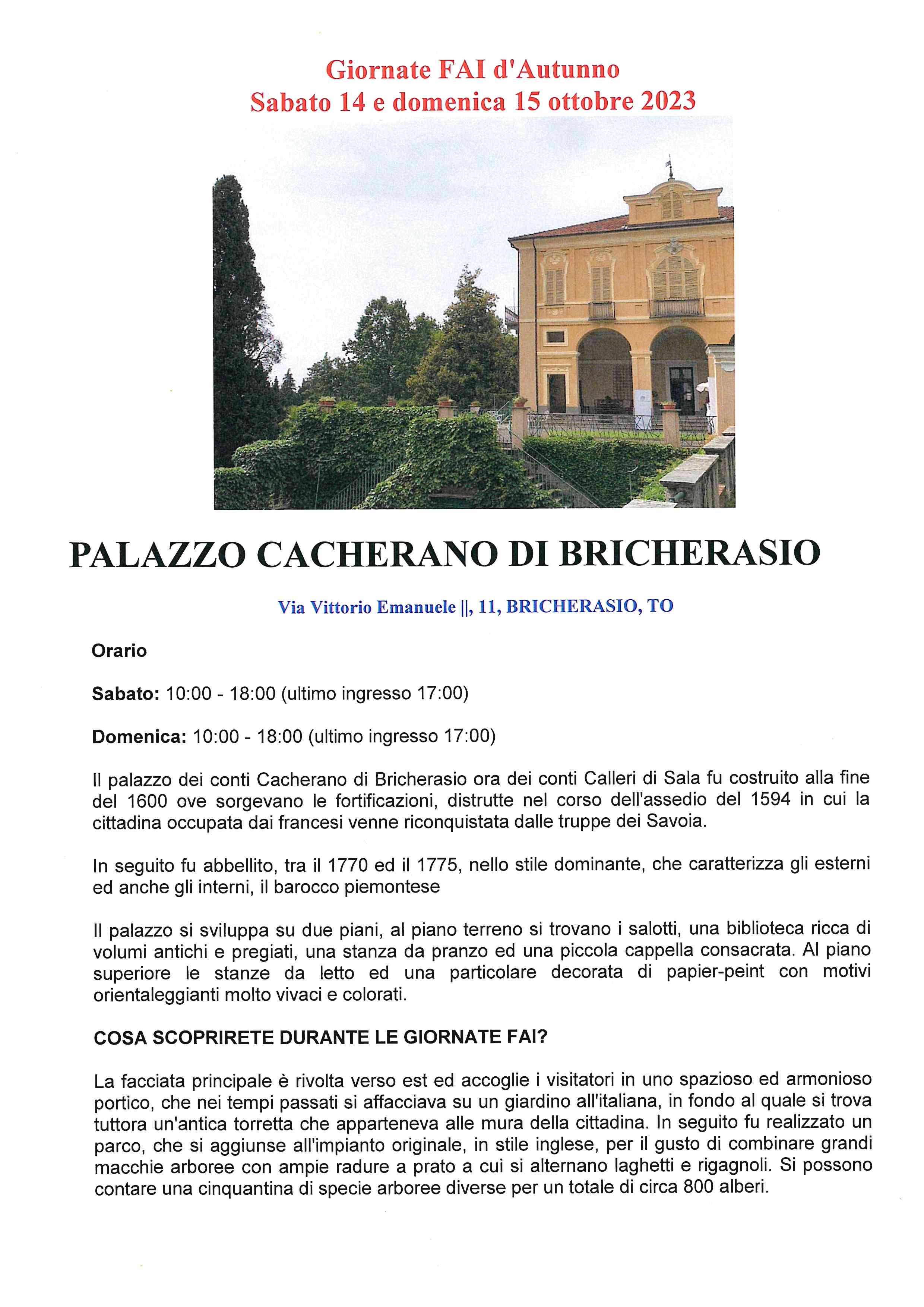 Sabato 14 e Domenica 15 ottobre dalle ore 10 alle 18 il Palazzo dei Conti Cacherano di Bricherasio di Via Vittorio Emanuele II, n. 11 in occasione delle giornate FAI d’autunno apre agli interessati le porte di alcune stanze del primo piano della dimora con il parco. Durante le due giornate del FAI si scopriranno lo spazioso ed armonioso portico, che nei tempi passati si affacciava su un giardino all'italiana, in fondo al quale si trova tuttora un'antica torretta che apparteneva alle mura della cittadina. In seguito fu realizzato un parco, che si aggiunse all'impianto originale, in stile inglese, per il gusto di combinare grandi macchie arboree con ampie radure a prato a cui si alternano laghetti e rigagnoli. Si possono contare in un ambiente da favola una cinquantina di specie arboree diverse per un totale di circa 800 alberi. La visita del parco inizia con un percorso immerso in un ambiente fiabesco, il parco a terrazzo, con un parte esposta al sole e una più boschiva con tantissimi tipi di piante, una parte di laghetti e un fiume con canneto, con stupendi giochi di luce e acqua. Alberi e acqua che creano un vero "Polmone di ossigeno" per tutto il paese...con quattro ettari di terreno ricchi di piante, uccelli migratori, scoiattoli, carpe nei laghi. Infine esiste ancora una parte di muro originaria, che fa parte delle antiche mura custodita nel tempo, dove il tutto avvolge il visitatore in un ambiente davvero suggestivo. Non manca nemmeno la locomotiva storica che è posizionata alla fine. Non è richiesta prenotazione e per qualsiasi informazione si può scrivere una mail a palazzocontidibricherasio@gmail.com