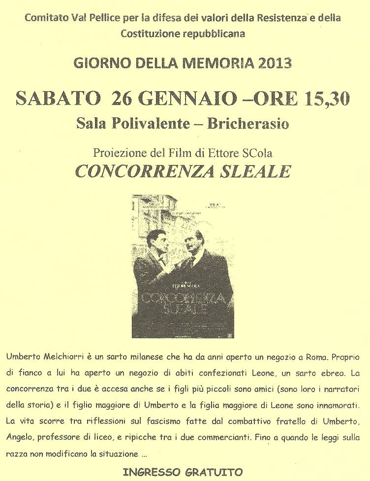 Il Comitato Val Pellice per la difesa dei valori della Resistenza e della Costituzione Repubblicana invita a partecipare al Giorno della memoria 2013 previsto per sabato 26 gennaio alle 15,30 nel Salone Polivalente di Via Vittorio Emanuele II a Bricherasio con la proiezione del film di Ettore Scola ”Concorrenza sleale”.