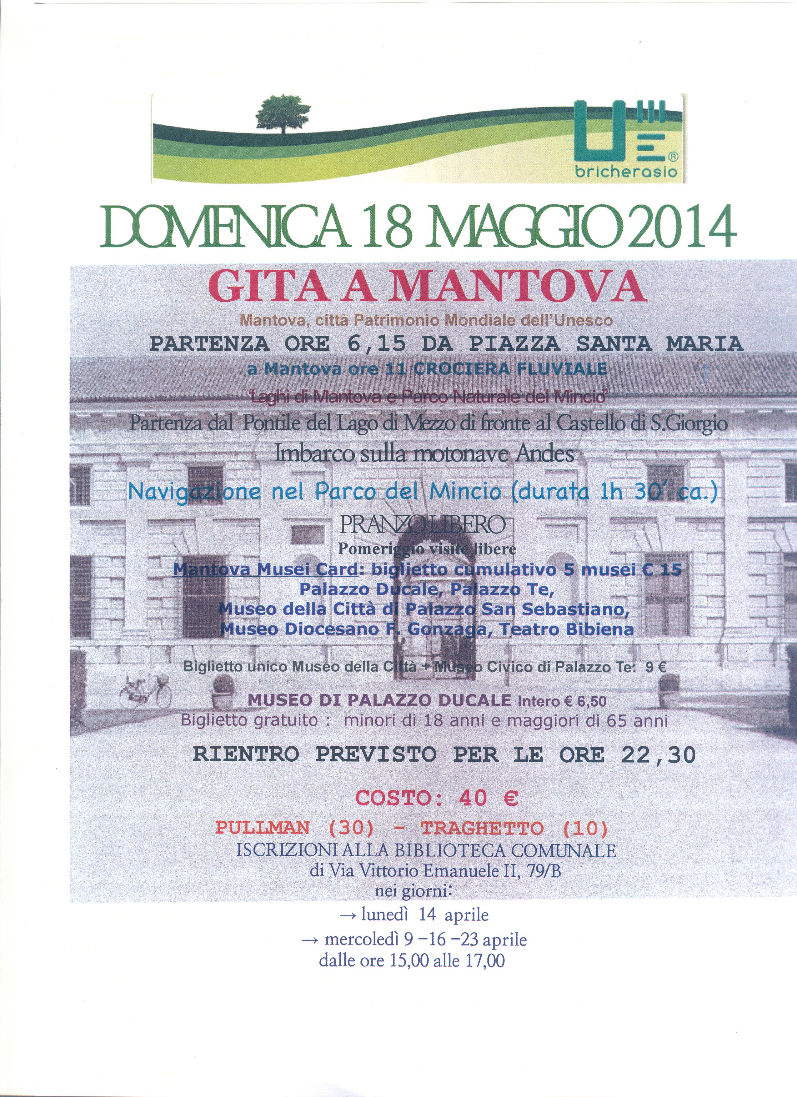 Sono aperte nei giorni di mercoledì 9, 16 e 23 e lunedì 14 aprile dalle 15 alle 17 presso la biblioteca comunale di Bricherasio di Via Vittorio Emanuele 79/B le iscrizioni per partecipare alla gita sociale organizzata dall’Unitre bricherasiese a Mantova prevista per Domenica 18 maggio per una visita alla Citta Patrimonio Mondiale dell’Unesco. La partenza da Piazza Santa Maria alle ore 6,15. Il ritorno in serata verso le 22,30. La quota di partecipazione è di 40,00 € comprensiva di pullman e traghetto per la navigazione nel Parco del Mincio con partenza dal pontile del Lago di Mezzo di fronte al Castello di San Giorgio. Il pranzo è libero. Nel pomeriggio visite libere ai musei di Mantova tra i quali palazzo Te, Palazzo Ducale