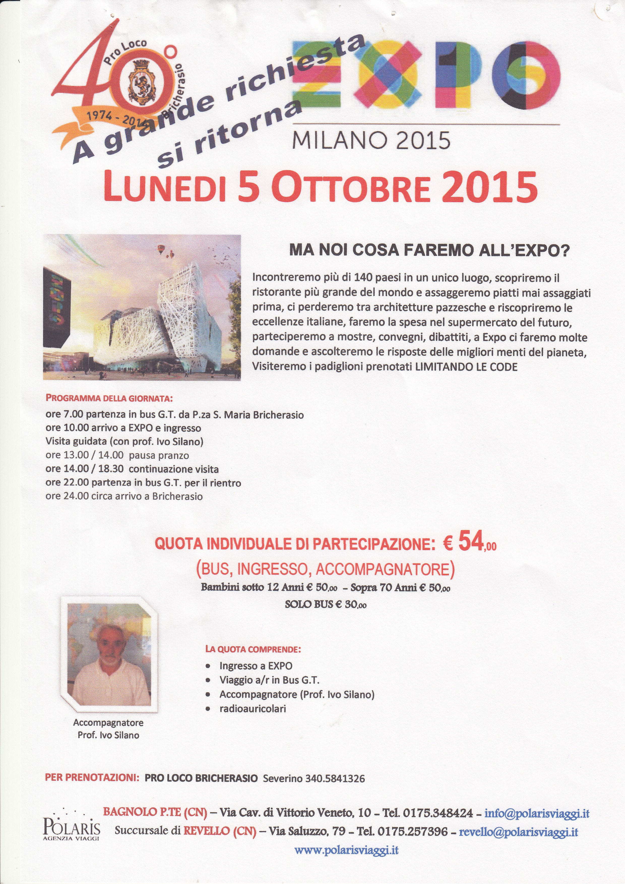 A grande richiesta la Pro Loco di Bricherasio riorganizza per lunedì 5 ottobre una gita a Milano per visitare l’expo. Expo Milano 2015 è l’Esposizione Universale che l’Italia sta ospitando fino al 31 ottobre ed è il più grande evento mai realizzato sull’alimentazione e la nutrizione. Un’area espositiva di 1,1 milioni di metri quadri, più di 140 Paesi e Organizzazioni internazionali coinvolti. Sono questi i numeri dell’evento internazionale più importante che si sta tenendo nel nostro Paese. Expo 2015 offre a tutti la possibilità di conoscere e assaggiare i migliori piatti del mondo e scoprire le eccellenze della tradizione agroalimentare e gastronomica di ogni Paese. Si potranno incontrare oltre 140 Paesi in un unico luogo, si scoprirà il più grande ristorante del mondo e si potrà assaggiare piatti mai gustati prima, si riscoprirà l’eccellenza italiana partecipando a mostre, convegni e dibattiti e si limiteranno le code ai padiglioni. Il programma della giornata prevede la partenza da Piazza Santa Maria alle ore 7 e l’arrivo a Milano verso le ore 10 per entrare all’expo con la guida del professore Ivo Silano. Dalle 13 alle 14 pausa pranzo con possibilità di pranzo al sacco oppure nei numerosi bar all’interno. Fino alle 18,30 continua la visita e alle ore 20 iniziano gli spettacoli proposti da Expo. Alle 22 partenza per il rientro previsto verso mezzanotte. La quota di partecipazione è sempre di 54 euro comprensiva di autobus, ingresso ed accompagnatore. Per informazioni e prenotazioni telefonare al Presidente della Pro Loco Severino Morero al numero 340/5841326 oppure rivolgersi a Polaris Viaggi di Bagnolo Piemonte.