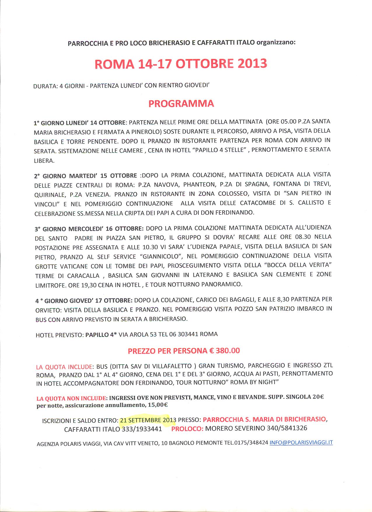 L’Associazione Pro Loco di Bricherasio, la Parrocchia Santa Maria e la macelleria Caffaratti organizzano una gita a Roma dal 14 al 17 ottobre in autobus gran turismo. La quota di partecipazione comprensiva di viaggio, pernottamento in hotel 4 stelle, accompagnatore e tour notturno “Roma by night” è di 380 € a persona. Per informazioni e iscrizioni rivolgersi entro sabato 21 settembre a Don Ferdinando oppure telefonare ai numeri 340/5841326 e 333/1933441.
