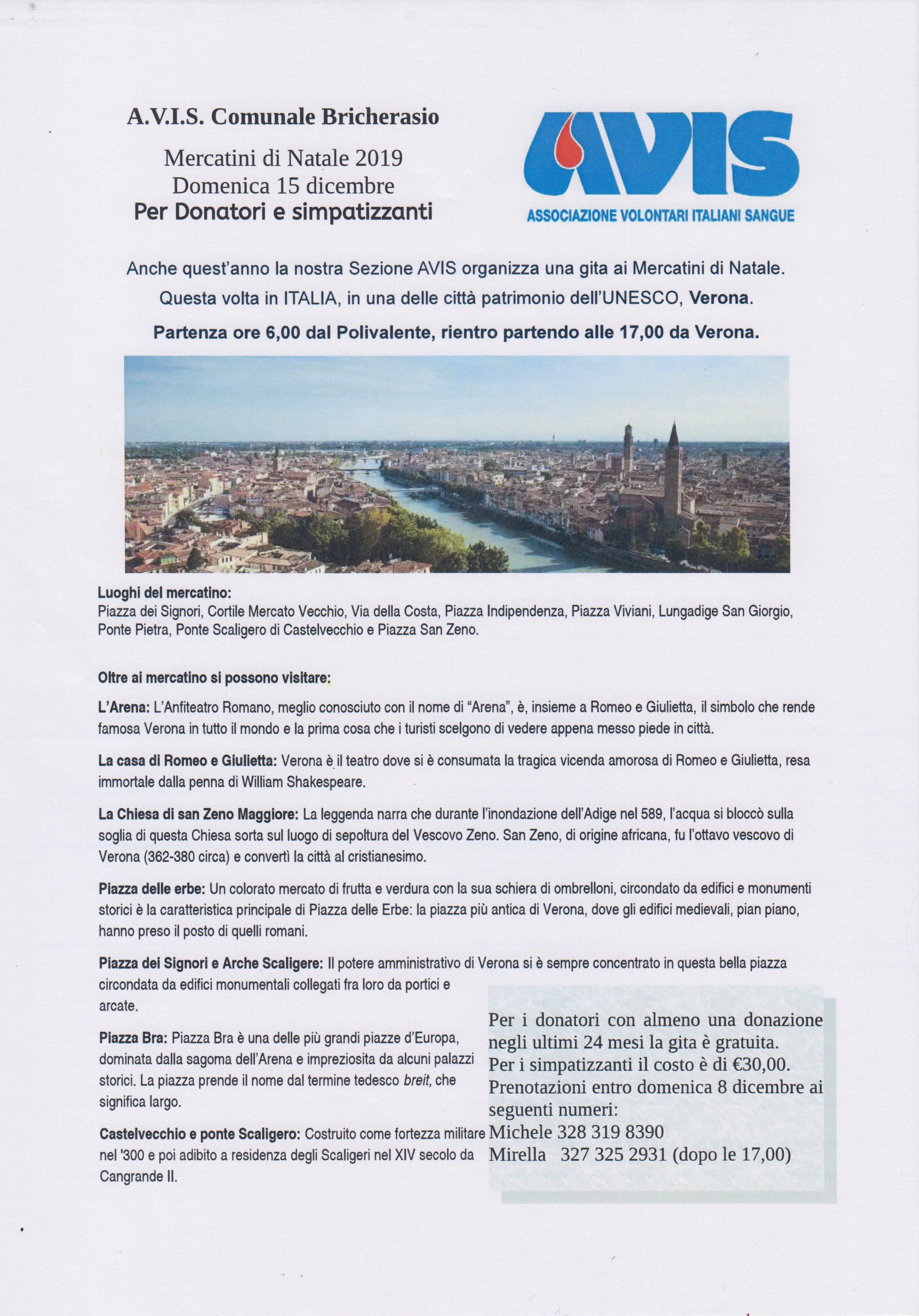 L'A.V.I.S. Comunale Bricherasio in occasione dei Mercatini di Natale 2019 organizza per Domenica 15 dicembre una gita in una delle città patrimonio dell’UNESCO, Verona per donatori e simpatizzanti. La partenza alle ore 6,00 dal Polivalente, rientro partendo alle 17,00 da Verona. I luoghi del mercatino che siu visiteranno sono Piazza dei Signori, Cortile Mercato Vecchio, Via della Costa, Piazza Indipendenza, Piazza Viviani, Lungadige San Giorgio, Ponte Pietra, Ponte Scaligero di Castelvecchio e Piazza San Zeno. Oltre ai mercatino si possono visitare l’Arena e la casa di Romeo e Giulietta, il simbolo che rende