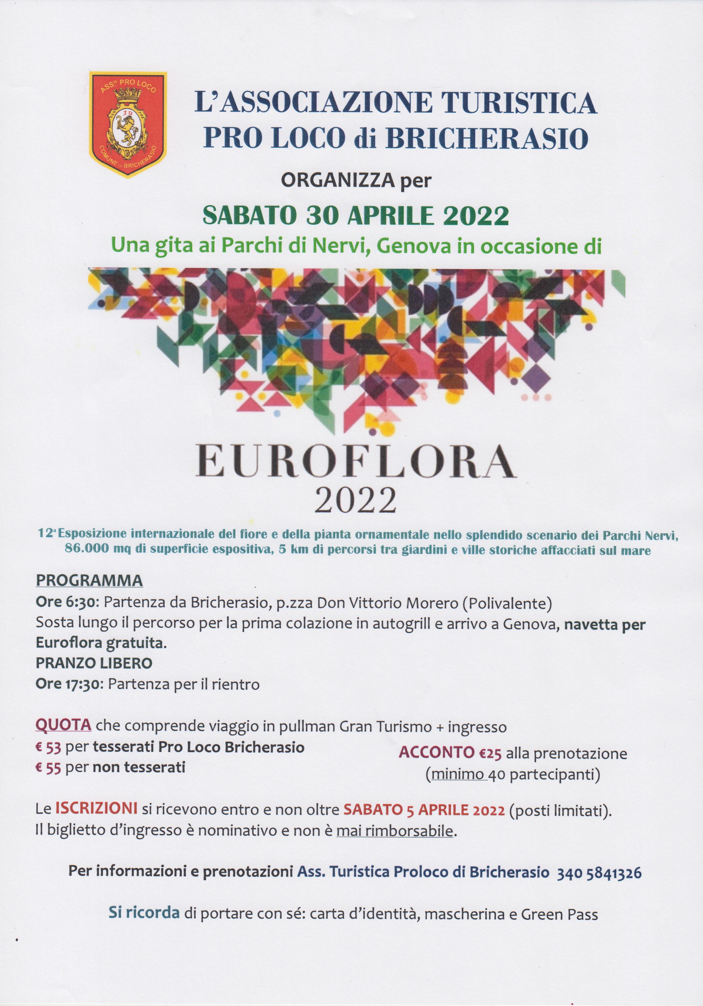 La Pro Loco di Bricherasio organizza una gita a Nervi in occasione di Euroflora 2022 per sabato 30 aprile. La 12^ esposizione internazionale del fiore e della pianta ornamentale torna in terra ligure nello splendore dei Parchi Nervi dove 86.000 metri quadri di superficie espositiva e 5 chilometri di percorsi tra giardini e ville storiche affacciati sul mare attendono i visitatori. La quota di partecipazione che comprende viaggio in pullman gran turismo ed ingresso è fissata in € 53 per i tesserati all'Associazione e 55 € per coloro che sono sprovvisti di tessera. La partenza è prevista per le ore 6,30 dal Salone Polivalente di Piazza Don Morero a Bricherasio con sosta in autogrill per la prima colazione. Dopo l’arrivo a Genova navetta gratuita per l’esposizione internazionale con pranzo libero. Per motivi organizzativi prenotarsi entro sabato 5 aprile e sono da ritenersi valide fino ad esaurimento ingressi alla kermesse e si consiglia pertanto l’iscrizione prima possibile. Si ricorda di portare carta d’identità, mascherina e green pass. Per informazioni e prenotazioni rivolgersi all'Associazione Pro Loco al 340/5841326.