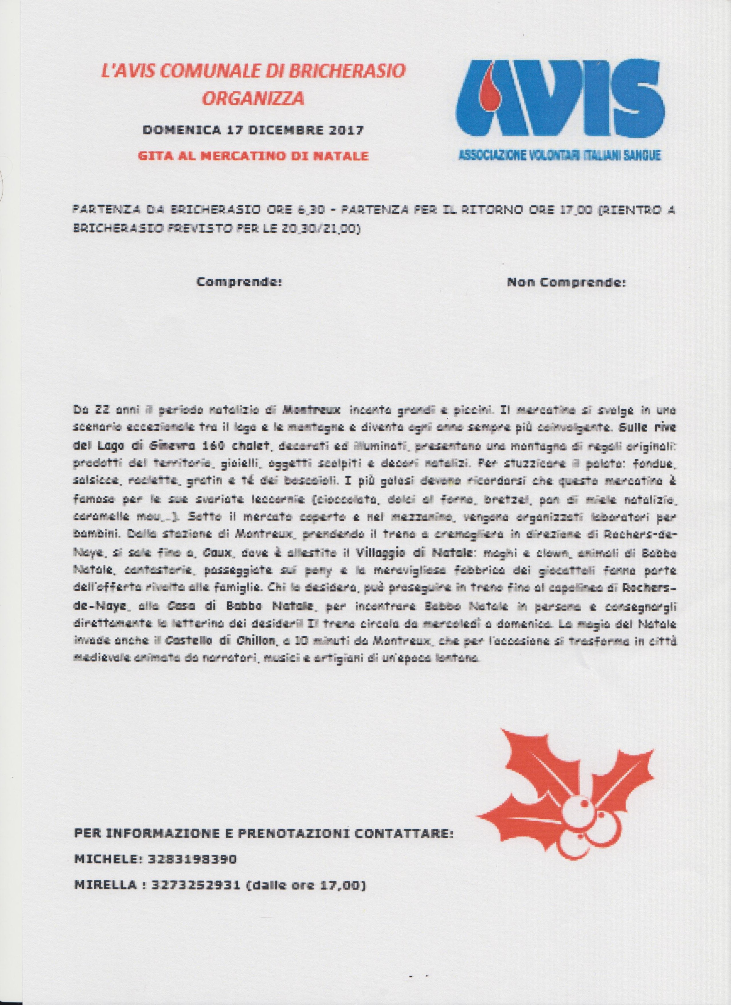L'AVIS di Bricherasio organizza una gita a Montreux in occasione del mercatino di Natale per Domenica 17 dicembre. La partenza è fissata alle ore 6,30 con ritorno previsto per le 21. Da 22 anni il periodo natalizio di Montreux incanta grandi e piccini. Il mercatino sisvolge in uno scenario eccezionale tra lago e montagne. Per informazioni e prenotazioni contattare entro domenica 10 dicembre il presidente Michele Savalli al 328/3198390 oppure, dopo le ore 17, Mirella al 327/3252931.