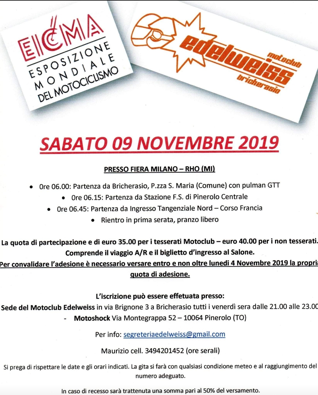 Il Motoclub Edelweiss di Bricherasio organizza la consueta gita al Salone del ciclo e del motociclo “Eicma 2019” nell’area espositiva di Rho (Milano) per sabato 9 novembre in occasione dell’esposizione mondiale del motociclismo. Il programma prevede alle ore 6 la partenza da Piazza Santa Maria a Bricherasio, in pullman con passaggio alla stazione F.S. di Pinerolo e all’ingresso della tangenziale nord all’altezza di Corso Franciaa Torino alle 6,45 ed il rientro in prima serata, con pranzo libero. La quota di partecipazione è di € 35.00 per i tesserati al Motoclub bricherasiese ed € 40.00 per i non tesserati e comprende il viaggio ed il biglietto di ingresso al Salone. Per convalidare l’adesione è necessario versare entro e non oltre lunedì 4 novembre la quota di adesione. L’iscrizione può essere effettuata alla sede del Motoclub Edelweiss in Via Brignone 3 a Bricherasio tutti i venerdì sera dalle 21 alle 23 oppure da Motoshock in via Montegrappa 52 a Pinerolo. Per maggiori informazioni telefonare in orario serale a Maurizio al 349-4201452 oppure contattare telematicamente la segreteriaedelweiss@gmail.com