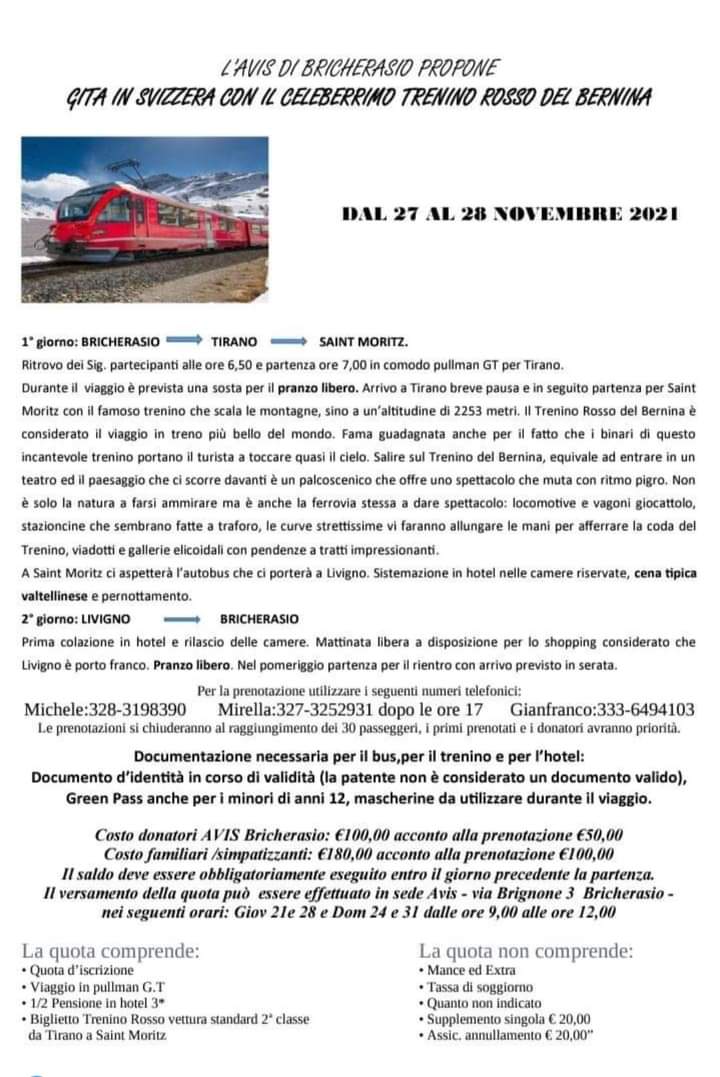 L’AVIS di Bricherasio ricorda ai partecipanti della gita sociale in Svizzera per andare sul celeberrimo trenino rosso del Bernina che scala le montagne da Tirano a Saint Moritz e Livigno prevista per sabato 27 e Domenica 28 novembre di munirsi, oltre alla carta d’identità in corso di validità, del green pass anche per i minori di 13 anni e di mascherine da utilizzare sia durante il viaggio che sul posto. Considerato il viaggio in treno più bello del mondo, fama guadagnata in virtù che i binari portano i partecipanti a toccare il cielo, perchè salirci sopra equivale ad entrare in un teatro con un paesaggio che è un palcoscenico di natura, con la ferrovia stessa che offre lo spettacolo offerto da locomotive e vagoni giocattolo, stazioncine che sembrano costruite a traforo, curve strettissime da allungare le mani per afferrare la coda del trenino, viadotti e gallerie elicoidali con pendenze impressionanti. Maggiori informazioni chiamare Michele al 328/3198390 oppure Mirella al 327/3252931.