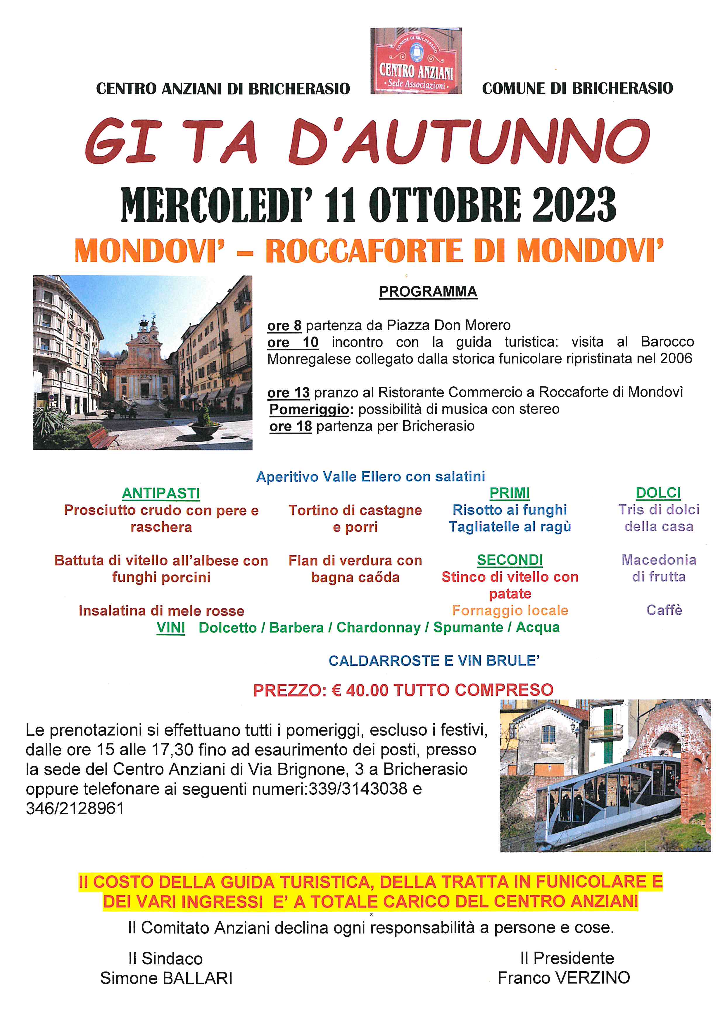 Al Centro Anziani di Bricherasio con la collaborazione con il Comune si prepara l’immancabile gita d’autunno per mercoledì 11 ottobre a Mondovì e Roccaforte di Mondovì. Il programma prevede alle ore 8 la partenza da Piazza Don Morero. Alle 10 la visita guidata al Barocco Monregalese collegato dalla storica funicolare ripristinata nel 2006. Alle ore 13 il pranzo al Ristorante Commercio a Roccaforte di Mondovì e pima del rientro a Bricherasio previsto per le 18 musica per gli interessati. Il costo della gita a persona è di 40 €, poiché i costi della guida, della tratta in funicolare e dei vari ingressi è a totale carico dell’Associazione. Per informazioni e prenotazioni sino ad esaurimento dei posti, rivolgersi tutti i pomeriggi, dalle ore 15 alle 17,30, al Centro Anziani di Via Brignone, 3 a Bricherasio oppure telefonare al 339/3143038 oppure al numero 346/2128961.