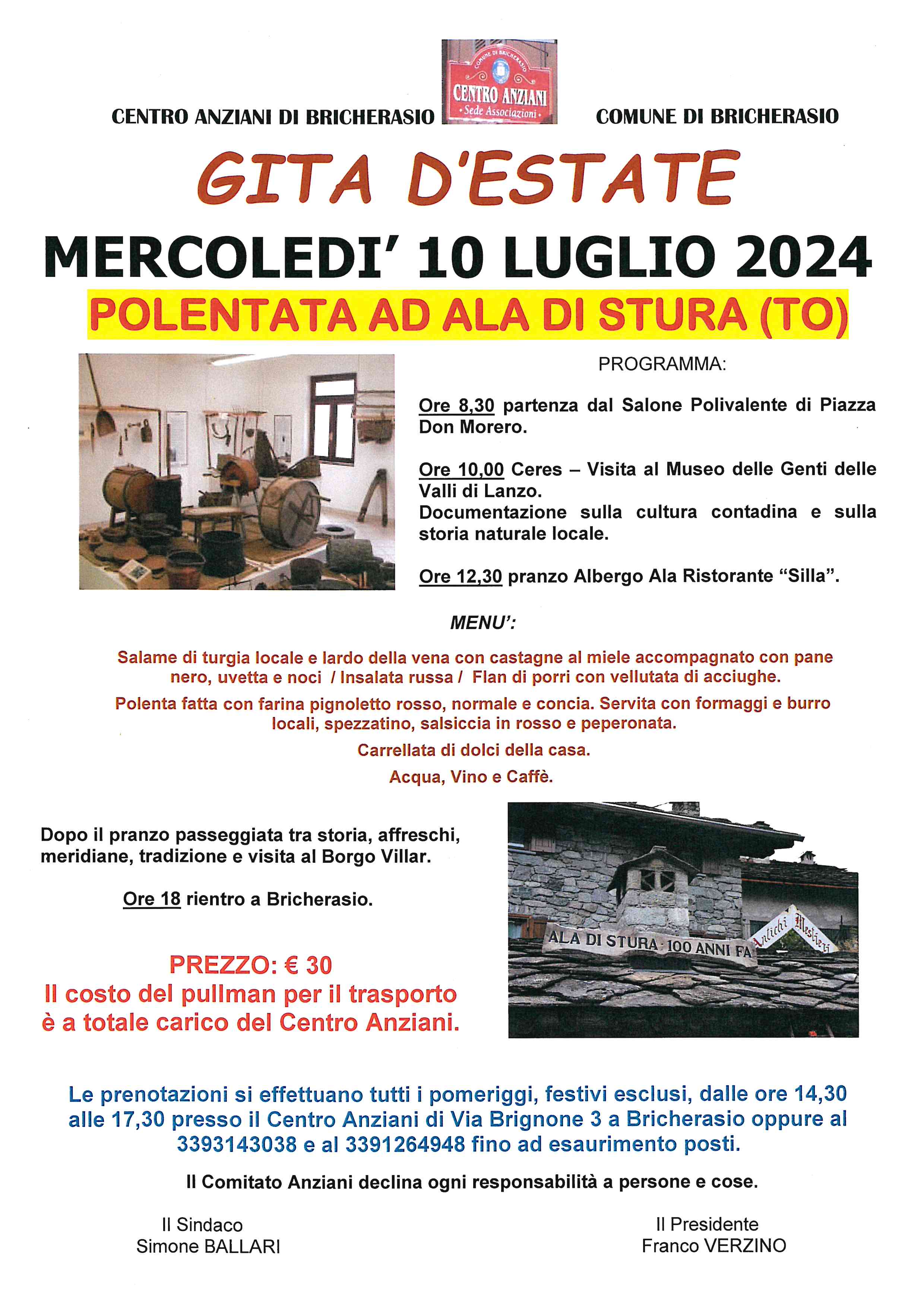 Il Centro Anziani di Bricherasio, in collaborazione con il Comune, organizza la classica gita d’estate per la polentata mercoledì 10 luglio ad Ala dl Stura. Il programma prevede alle ore 8,30 la partenza dal Salone Polivalente di Piazza Don Morero di Bricherasio direzione Ceres per la visita al Museo delle Genti delle Valli di Lanzo con documentazione sulla cultura contadina e sulla storia naturale locale. Alle 12,30 il pranzo all’Albergo Ala Ristorante “Silla” di Valmala con il seguente menù: