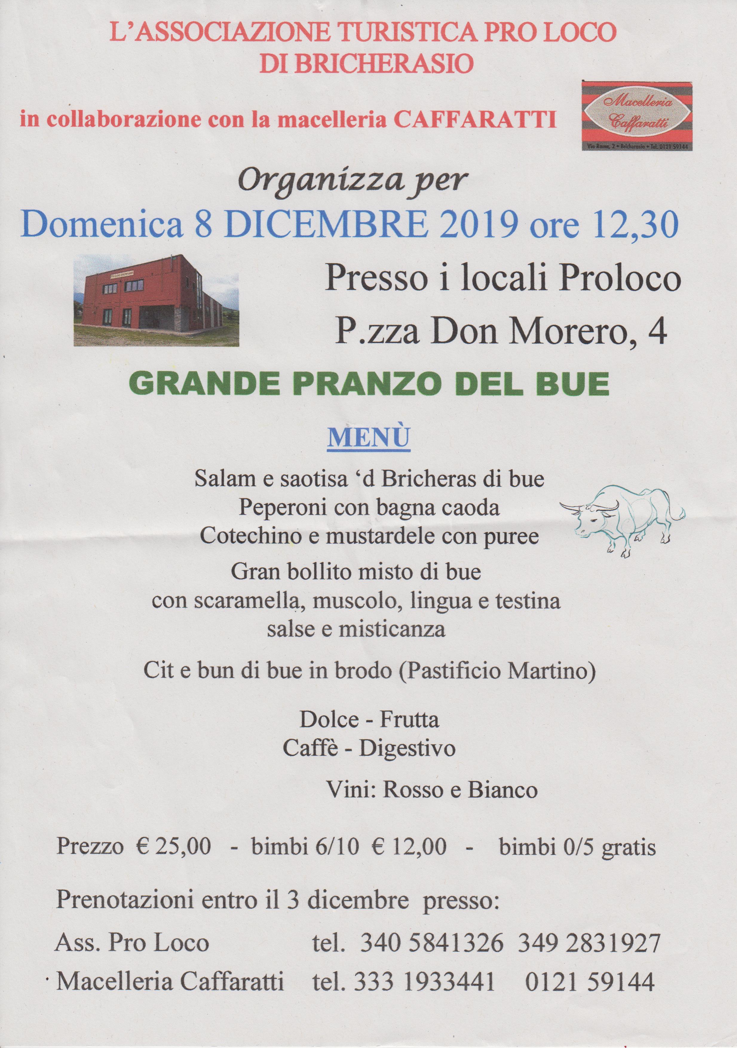 L’Associazione Turistica Pro Loco di Bricherasio in collaborazione con la Macelleria Caffaratti organizza per Domenica 8 dicembre alle ore 12.30 nella sede dell’Associazione Pro Loco in Piazza Don Vittorio Morero, 4 (vicino al salone polivalente), la diciassettesima edizione del classico convivio del bue diventato da qualche anno grande pranzo. La quota di partecipazione per gli adulti è di € 25 mentre per i bimbi dai 6 ai 10 anni è di € 12. Per informazioni e prenotazioni entro martedì 3 dicembre rivolgersi all’Associazione Pro Loco al numero 340/5841326 oppure alla macelleria Caffaratti allo 0121/59144. L'evento rientra nelle manifestazioni della XXI edizione del Natale a Bricherasio.