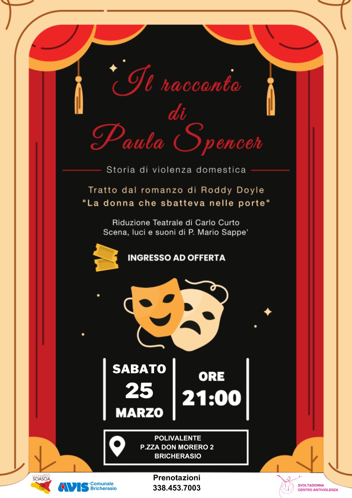 L’Associazione Culturale Leonardo Sciascia e l’Avis di Bricherasio propongono “Il racconto di Paula Spencer”, rappresentazione teatrale prevista per le ore 21 di sabato 25 marzo al Salone Polivalente di Piazza Don Morero, 2 a Bricherasio. Lo spettacolo, organizzato in collaborazione con Svolta Donna, riguarda di una storia di violenza domestica ed è tratto dal romanzo di Roddy Doyle “La donna che sbatteva nelle porte” con riduzione teatrale di Carlo Curto. Ingresso ad offerta libera con tutto il ricavato che sarà devoluto in beneficenza e prenotazioni dei posti disponibili al numero 338/4537003