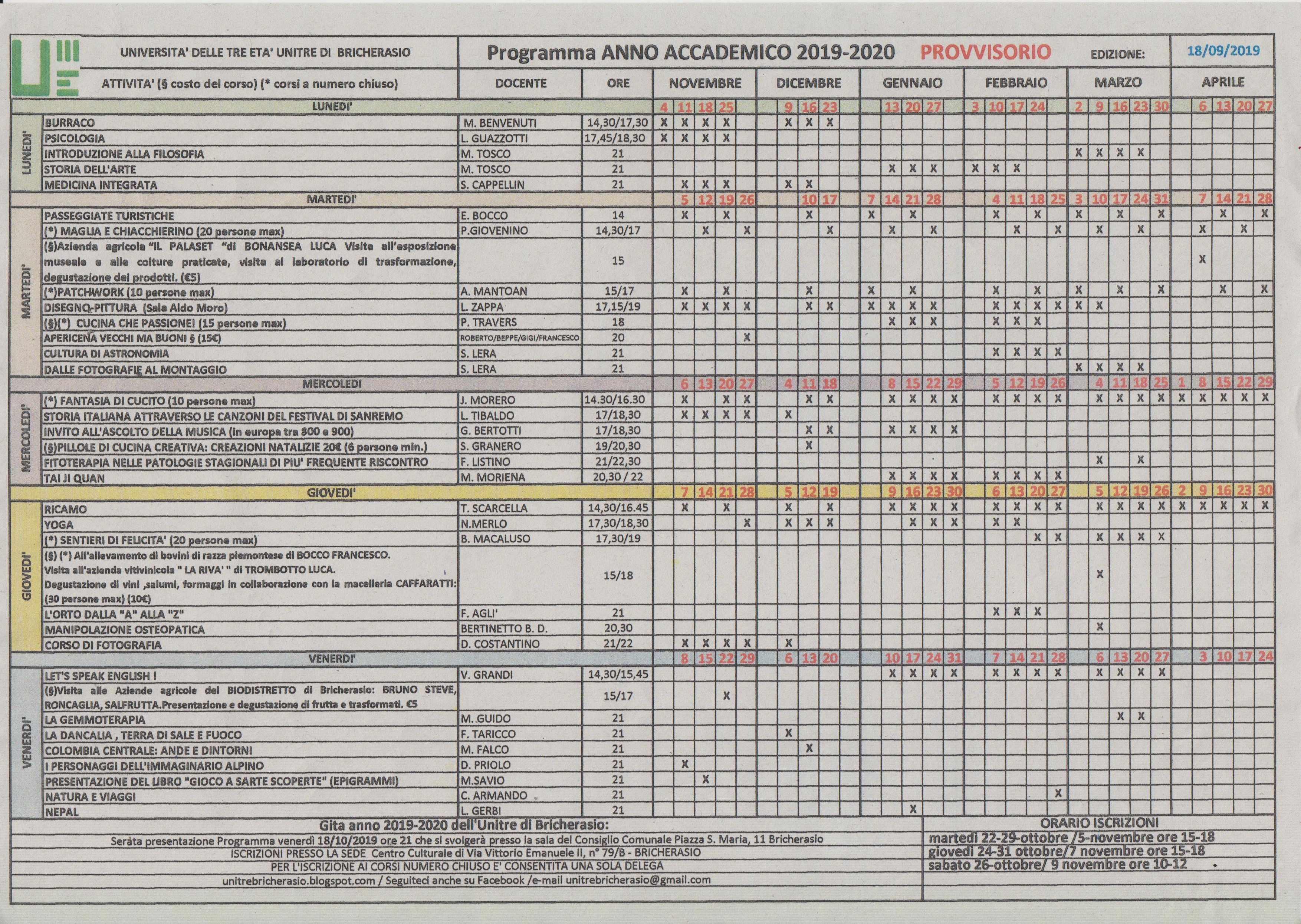 Una grande soddisfazione, altro motivo d’orgoglio per Annamaria Garzena, Presidente dell’Università delle Tre Età di Bricherasio è che la quota associativa d’iscrizione all’Associazione non è mai aumentata e resta invariata a 25,00 € e dà diritto alla frequenza di tutti i corsi ed alla partecipazione alle conferenze. Per alcuni laboratori è prevista una quota di partecipazione. Le proiezioni sono libere a tutti, mentre i corsi possono essere frequentati solo dagli iscritti mentre per alcuni laboratori è prevista una quota di partecipazione. Le adesioni all’Unitre di Bricherasio si effettuano in sede, al Centro Culturale “Aldo Moro” di Via Vittorio Emanuele II, 79/B dalle ore 15 alle 18 di martedì 22 e 29 ottobre e giovedì 24 e 31 e sabato 25 ottobre dalle 10 alle 12. “La nostra è un'associazione totalmente fondata sul volontariato, un lavoro senza alcun compenso, ma che appaga profondamente. Desidero ringraziare tutti quelli che collaborano con me a dirigere l'associazione verso le sue finalità, agli iscritti che partecipano e rendono vive le nostre iniziative e ci spingono a ricercarne sempre altre e soprattutto i docenti che mettono a disposizione di tutti noi le loro conoscenze e competenze” afferma la Presidente. L’Unitre di Bricherasio da ventidue anni attiva sul territorio con lo scopo di contribuire alla trasmissione del sapere si è trasformata in luogo di incontro, scambio, crescita ed arricchimento personale ed aperta ad ogni età, l’Unitre offre ai suoi associati una ricca scelta tra sei serate con proiezione di diapositive e filmati sulla Dancalia, terra di sale e fuoco, con Federica Taricco, il Dottore Mauro Falco illustra il suo viaggio in Colombia centrale, I personaggi dell’immaginario alpino di Diego Priolo e la presentazione del libro “Gioco a carte scoperte” di Maurizio Savio nel corso di quest’anno. Il ciclo di proiezioni si conclude con due serate nel 2020. Luciano Gerbi racconta il Nepal e Cristina Armando conduce la serata sulla Natura e viaggi che chiude il ciclo di conferenze con proiezione di diapositive e filmati. quattro le visite previste, dalle aziende agricole del territorio, la prima per novembre da Steve Bruno, Roncaglia e Salfrutta per la presentazione e degustazione di frutta, la seconda all’allevamento di bovini di razza piemontese di Francesco Bocco con l’azienda vitivinicola “La Rivà”di Luca Trombotto che in collaborazione con la Macelleria Caffaratti propongono, per l’inizio di marzo, una degustazione di vini, salumi e formaggi. Agli inizi di aprile l’Unitre si reca prima alla sede dell’Eco del Chisone e dopo all’azienda agricola “Il Palaset” di Luca Bonansea con il suo museo per una visita alle colture e al laboratorio di trasformazione con degustazione dei prodotti. Dopo il grande successo dello scorso anno torna l’apericena conviviale alla Scuola Malva Arnaldi di Bibiana con vini vecchi ma buoni condotto da Roberto, Beppe, Gigi e Francesco previsto alla fine di novembre, inoltre si segnalano le new entry degli incontri di pillole culinarie per le creazioni natalizie di metà dicembre di Sara Granero, dei Fiori in festa con Michela Mulineris in occasione delle festività natalizie e pasquali, di informazione sulla manipolazione osteopatica di marzo di Bartolomeo Davide Bertinetto. La Gemmoterapia con Maddalena Guido impegna gli interessati due serate anch’esse nel mese di marzo. Non mancano le classiche passeggiate turistiche del martedì pomeriggio per il paese alla scoperta degli scorci più significativi di Bricherasio condotte come sempre da Elena Bocco. I corsi di Burraco, Storia italiana attraverso le canzoni del Festival di Sanremo, Introduzione alla filosofia, l’Orto dalla A alla Z e Sentieri di felicità sono alcune delle nuove proposte dell’Unitre di Bricherasio. Le altre materie programmate sono dagli immancabili classici come Psicologia, Ricamo, Yoga, Maglia e Chiacchierino, Disegno e pittura, Fantasia di Cucito, Patchwork, e Cucina che passione ai più moderni Cultura di Astronomia, Fotografia, Dalle fotografie al montaggio, Storia dell'Arte, Medicina integrata, Invito all'ascolto della musica, Tai Ji Qua, Inglese e Fitoterapia nelle patologie di stagione. Da programmare la gita sociale di due giorni prevista a fine anno mentre all’indirizzo internet unitrebricherasio.blogspot.com si possono reperire informazioni utili sull’attività dell’Unitre di Bricherasio. Termina la Presidente “Da oltre venti anni l’Unitre occupa un posto speciale nella mia vita e penso in quella di molte altre persone, perché ci ha fatto incontrare amici con cui abbiamo condiviso interessi culturali, ma anche momenti di convivialità. Un nuovo anno di attività insieme ci attende, prepariamoci a ripartire”.