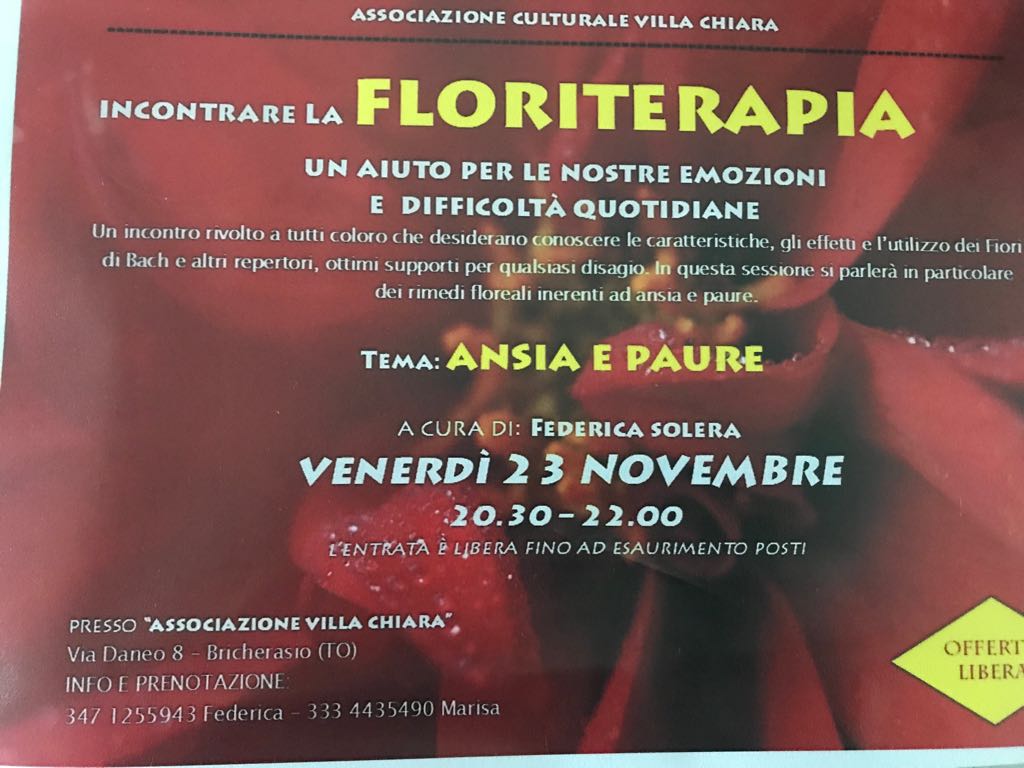 L’associazione Culturale Villa Chiara di Bricherasio organizza per venerdì 23 novembre dalle ore 20,30 alle 22 nella sede dell’Associazione in Via Daneo, 8 a Bricherasio un secondo incontro chiamato “Incontrare la floriterapia” a tema ansia e paure, rivolto a coloro che desiderano conoscere le caratteristiche, gli effetti e l’utilizzo dei fiori di Bach e altri repertori, ottimi supporti per qualsiasi disagio. Si parlerà in particolare dei rimedi floreali inerenti ad ansie e paure. L’ingresso è libero ad offerta fino ad esaurimento posti. Per ulteriori informazioni e per prenotazioni telefonare a Federica Solera al 347/1255943 oppure a Marisa Bocco al 333/4435490.
