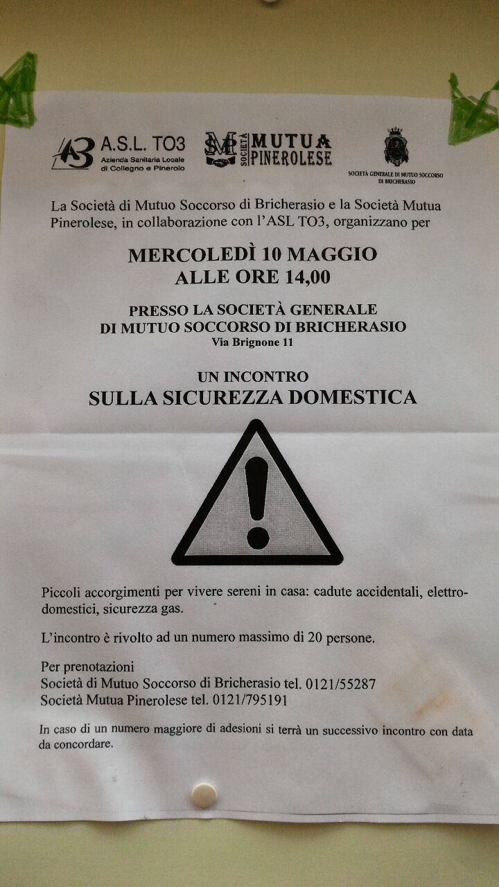 La Società di Mutuo Soccorso di Bricherasio e la Società Mutua Pinerolese in collaborazione con l'ASL TO 3 organizzano per mercoledì 10 maggio alle ore 14 un incontro sulla sicurezza domestica nella sede della società bricherasiese in Via Brignone. Piccoli accorgimenti per vivere sereni in casa, cadute accidentali, elettrodomestici, sicurezza del gas saranno gli argomenti del pomeriggio. Per informazioni telefonare ai numeri 0121/55287 e 0121/795191.