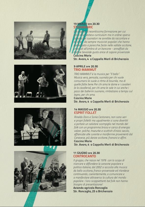 Il Centro Pedagogico di Danza e Cultura Popolare di Bricherasio organizza, in collaborazione con il Comune di Bricherasio e le Aziende Agricole del territorio, “L’appetito vien ballando”, quattro sabati di bal folk preceduti da degustazioni di prodotti locali. L’ultimo appuntamento è alle ore 20,30 di sabato 11 giugno all’Azienda Agricola Roncaglia in Strada Roncaglia, 25 a Bricherasio con il gruppo “Controcanto”, compagine musicale presente già da vari anni sulla scena musicale piemontese, con una proposta dedicata specificamente al bal folk composto da Ernesto Voena all'organetto e fisarmonica, Anna Loccisano alle percussioni, Angelo Girardi al basso, Francesco Giusta alla ghironda, Clara Mezzanatto e Giulia Tomasi al violino, Arcangelo Divita al clarinetto, Luigi Mingoni ai flauti e fiati e Marco Gajon alla chitarra . Il repertorio strumentale, è vasto e articolato, centrato sulla musica occitana dei due versanti delle Alpi, ma con vari sconfinamenti verso la Bretagna, i Paesi Baschi, i Paesi Scandinavi e l’Europa dell'Est. L'approccio nella riproposta di queste musiche è spontaneo e generoso, da veri amoureux della danza e del rapporto di scambio ed arricchimento reciproco che si crea con i ballerini. Ingresso 8 €. Per informazioni: 349/1815715 oppure www.facebook.com/centropedagogicodcp.