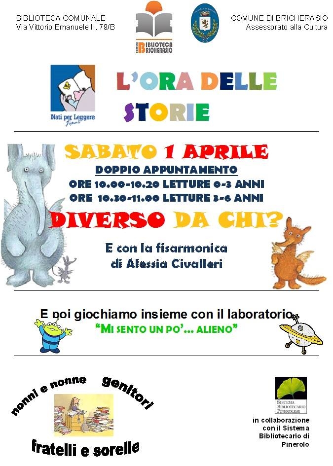 Con queste belle giornate primaverili la cosa ideale è fare un salto in biblioteca, prendere un bel libro e sdraiarsi all'ombra di un albero in fiore a leggere e godersi le prime belle giornate dell'anno. Il libro potreste cercarlo magari tra quelli dell'espositore dedicato nel tavolo delle novità, dove oltre ai nuovi titoli contraddistinti dal bollino colorato, c'è anche una ricca scelta di romanzi donati da voi tra cui tutta la serie di gialli medievali opera del'autrice Ellis Peters. Per i più giovani c'è invece a disposizione un pacco del Centro Rete di Pinerolo dedicato apposta a bimbi e bimbe dai 5 anni in su. Lo trovate sullo scaffale insieme agli altri del Centro rete ma...a portata di gambette. Lo scorso mese si sono tenuti in biblioteca i primi incontri degli alunni delle scuola elementare all'interno di un tirocinio formativo valido per i crediti universitari. Con grande gioia sono state fatte le tessere di iscrizione a tutti gli alunni delle classi che hanno aderito e si spera di vederli tornare non solo in orario scolastico. La Biblioteca Comunale di Bricherasio di Via Vittorio Emanuele II, 79 attende bambini e bambine fino ai 6 anni, a nonni e nonne, fratelli e sorelle e genitori sabato 1 aprile con l'appuntamento mensile dell’Ora delle Storie organizzato in collaborazione con il Sistema Bibliotecario di Pinerolo. Il tema è “Diverso da chi?” sempre con la doppia formula, per bimbi e bimbe fino ai 3 anni dalle 10 alle 10,20 mentre per i "grandi" dai 3 ai 6 anni dalle 10,30 alle 11. Anche questa volta sarà presente la fisarmonica di Alessia Civalleri. A seguire il laboratorio creativo "Mi sento un po’… alieno".