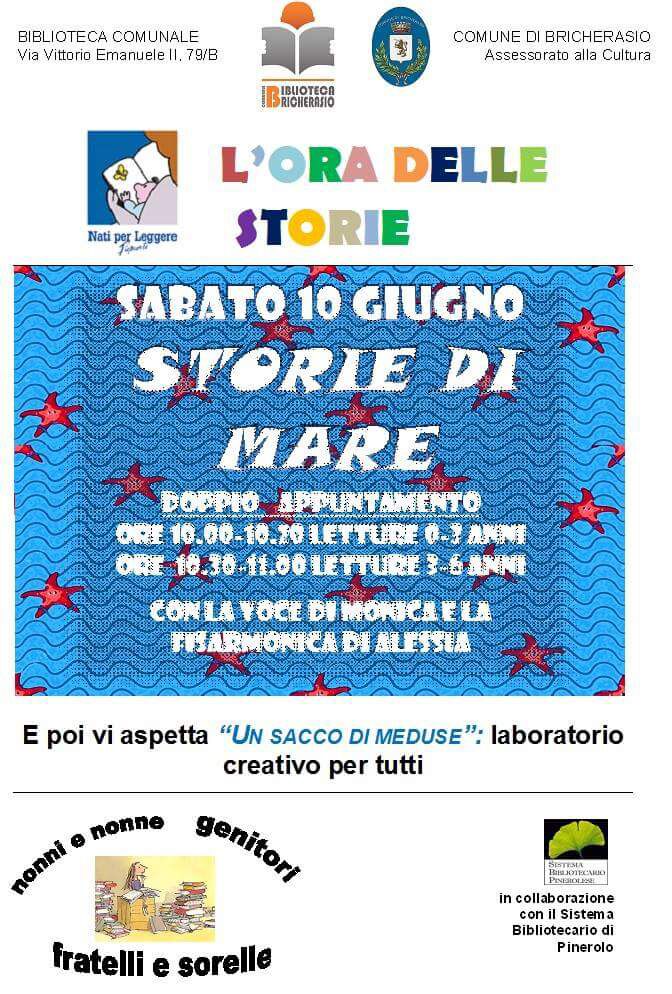 La Biblioteca Comunale di Bricherasio di Via Vittorio Emanuele II, 79 attende bambini e bambine fino ai 6 anni, a nonni e nonne, fratelli e sorelle e genitori sabato 10 giugno con l'appuntamento mensile dell’Ora delle Storie organizzato in collaborazione con il Sistema Bibliotecario di Pinerolo. Il tema è “Storie di mare” sempre con la doppia formula, per bimbi e bimbe fino ai 3 anni dalle 10 alle 10,20 mentre per i "grandi" dai 3 ai 6 anni dalle 10,30 alle 11. Presenti la fisarmonica di Alessia e la voce di Monica. A seguire il laboratorio creativo "Un sacco di meduse". Negli scorsi mesi si sono tenuti in biblioteca degli incontri con gli alunni della scuola elementare e con grande gioia sono state fatte le tessere di iscrizione a tutti gli alunni delle classi che hanno aderito e si spera di vederli tornare non solo in orario scolastico.