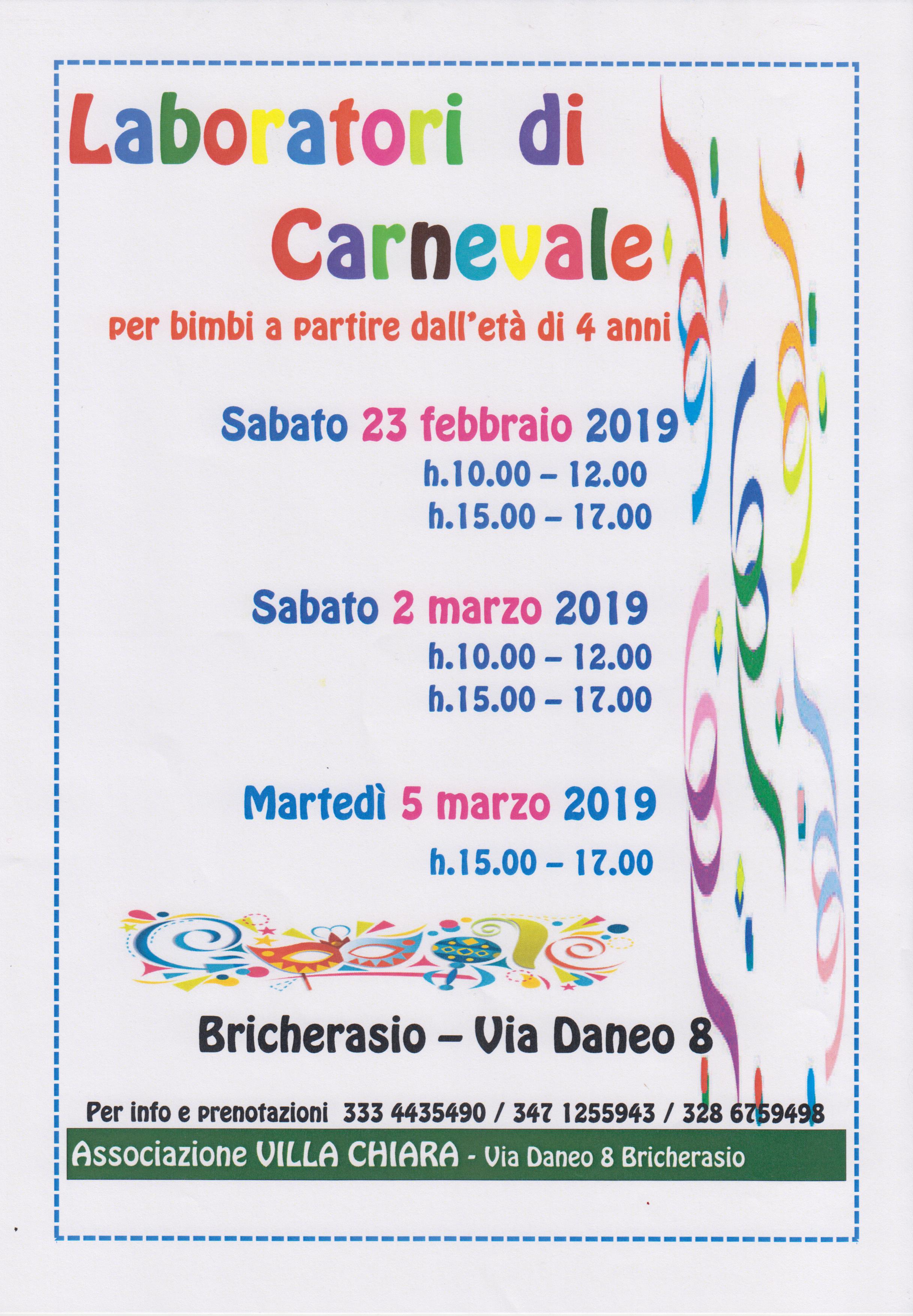 L'Associazione Villa Chiara di Bricherasio propone a cavallo dei mesi di febbraio e marzo tre appuntamenti con i laboratori di Carnevale per bimbi a partire dai 4 anni. Gli incontri sono fissati per sabato 23 febbraio e sabato 2 marzo dalle ore 10 alle 12 e dalle 15 alle 17. Ultimo incontro martedì grasso 5 marzo dalle 15 alle 17 nella sede dell'Associazione in Via Daneo, 8 a Bricherasio. Maggiori informazioni da Marisa 333/4435490, Federica 347/1255943 oppure Elisa 328/6759498.