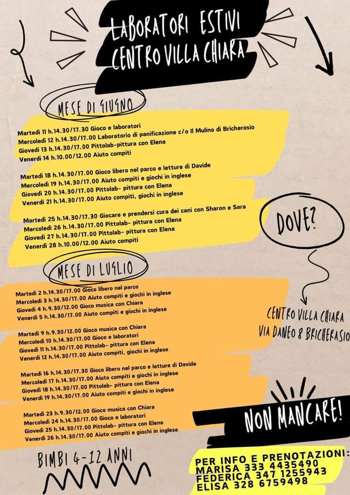 L'Associazione Villa Chiara di Bricherasio organizza al proprio centro (Via Daneo, 8) dei laboratori estivi ludici ed artistici riservati ai bambini dai 4 ai 12 anni,per esprimersi in modo divertente e creativo. Gli appuntamenti, quasi sempre in orario pomeridiano (fra le 14,30 e le 17) prevedono giochi liberi nel parco accompagnati dalle letture di Davide, il cantastorie che stupisce sempre i piccoli con i suoi racconti, oppure aiuto compiti e giochi in inglese o ancora laboratori di pittura (Pittolab con Elena).